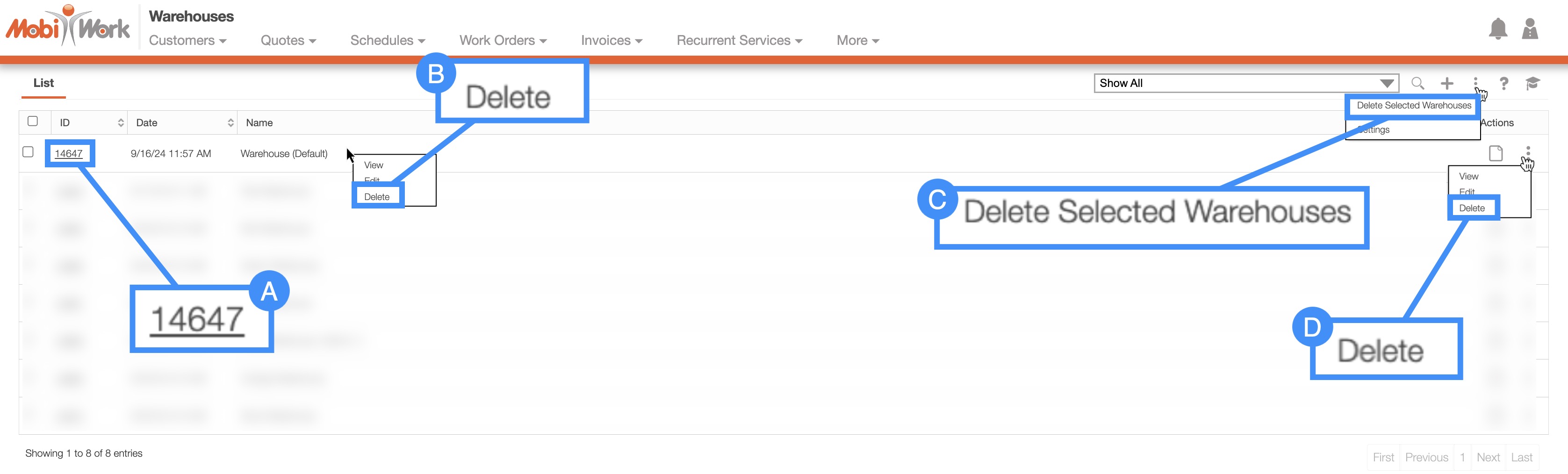 MobiWork allows you to delete multiple warehouses at once, thus saving you time and energy from having to delete warehouses one at a time.
