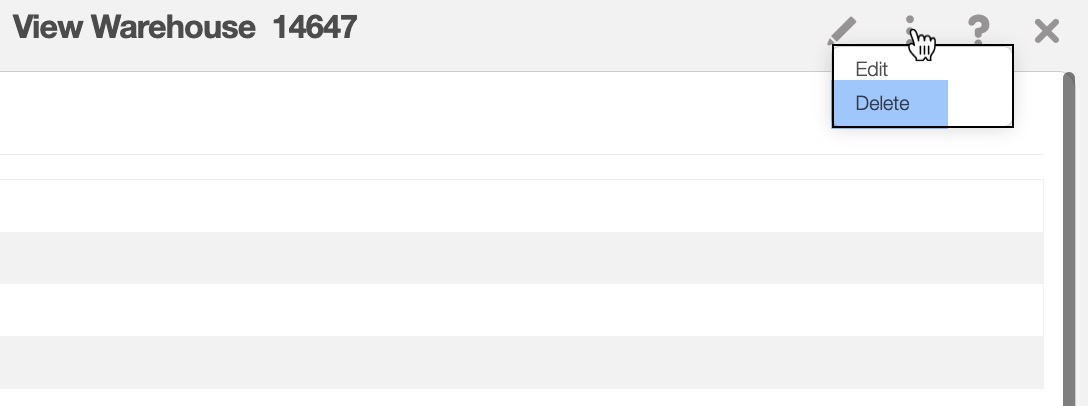 - In the upper right-corner of the View Warehouse pop-up window, you will see the Individual Actions button. You can delete the warehouse by selecting the "Delete" option: