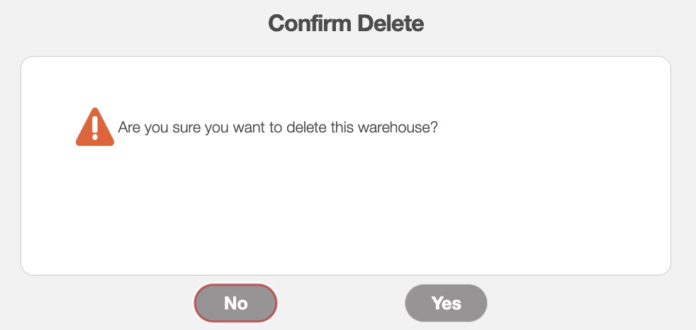 Regardless of how you choose to delete a warehouse, the Confirm Delete pop-up window will automatically appear:
