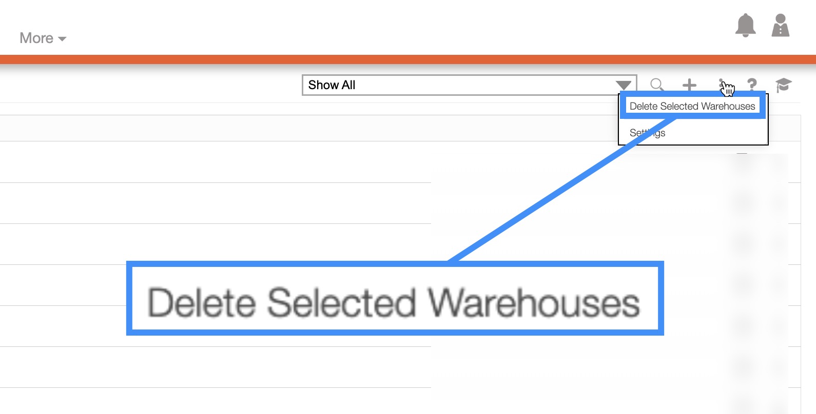 To delete multiple warehouses, you will need to access the More Actions button from the Warehouse "List" tab: