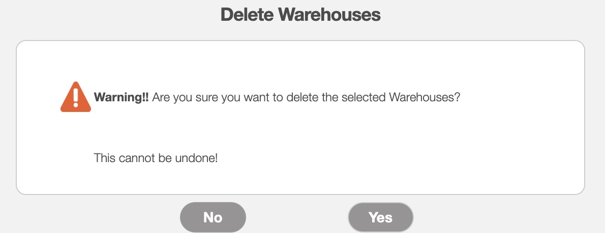 A warning will then appear asking to confirm if you would like to delete the selected warehouses, and informing you that the deletion of the warehouses will be permanent: