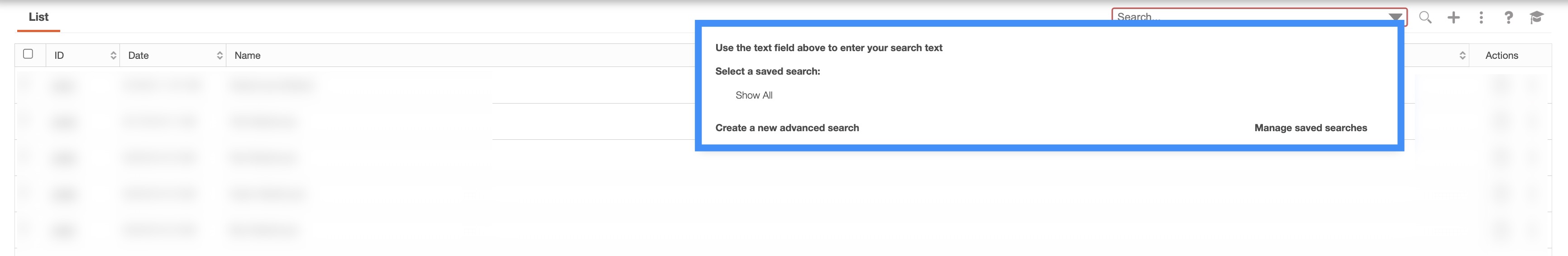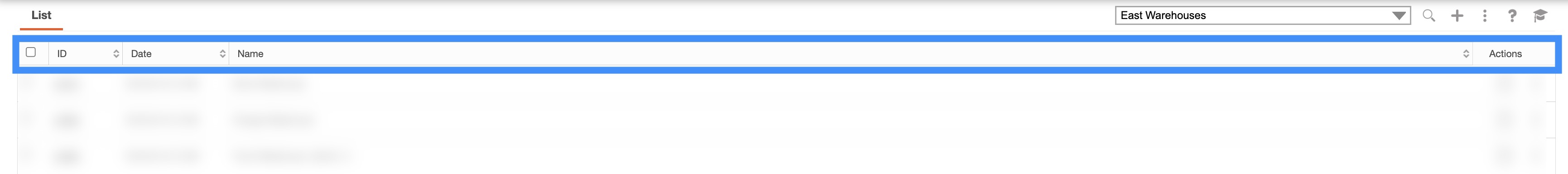 These columns are organized as: "ID," "Date," "Name," and "Actions:"