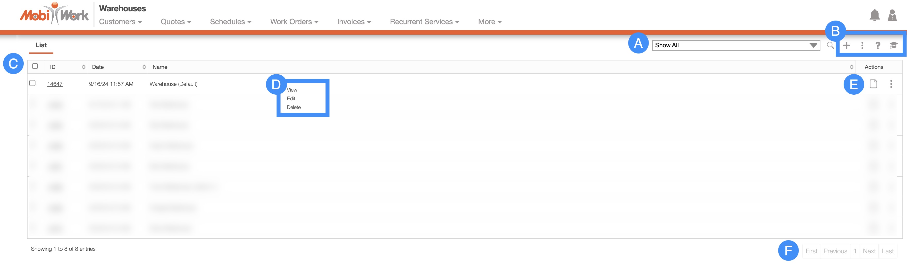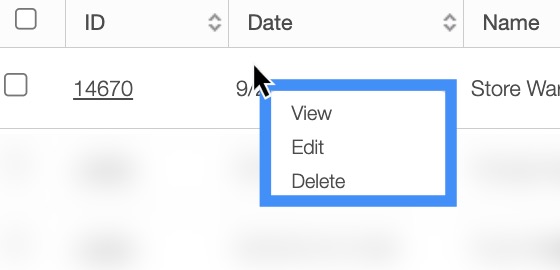 When selecting a warehouse and clicking on the Individual Actions button (the three vertical dots under the "Actions" column) you will be able to view, edit, or delete the warehouse.