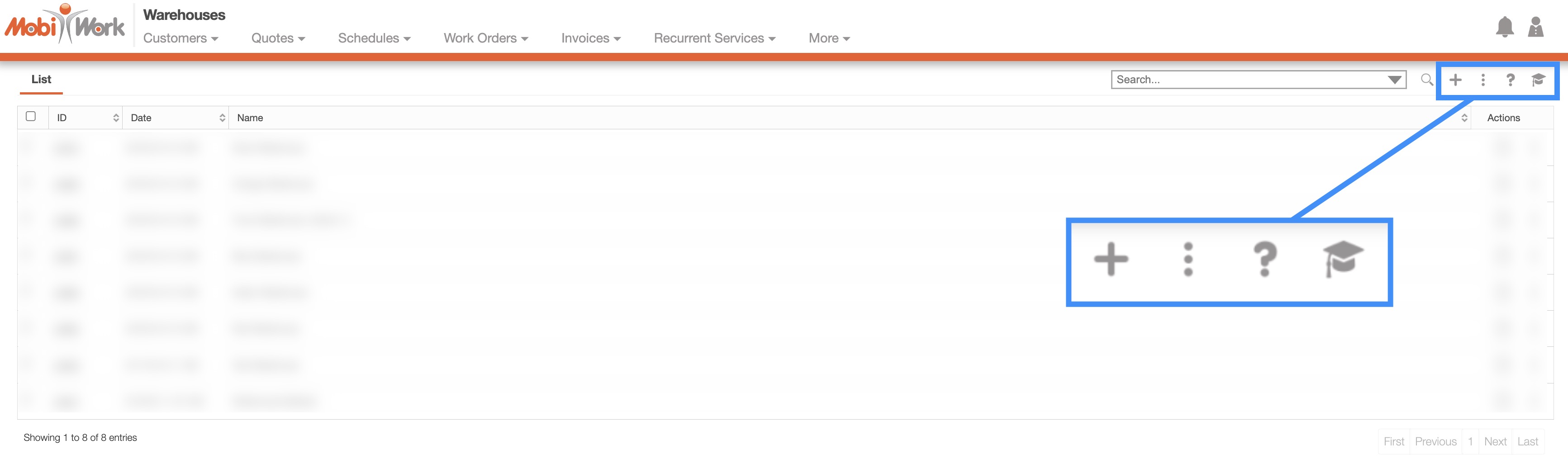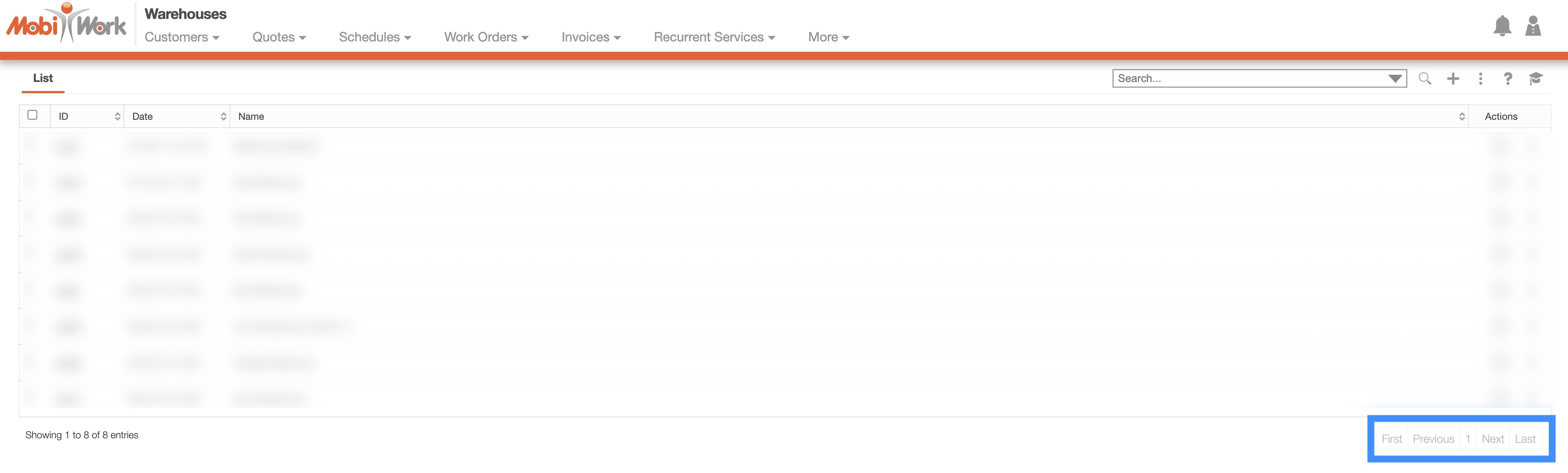 The Warehouses List page allows you to quickly view key details such as the creation date in MobiWork, warehouse name, and the warehouse ID. You can easily update or remove warehouses directly from this interface, streamlining your operations and ensuring your inventory management stays efficient and up-to-date.