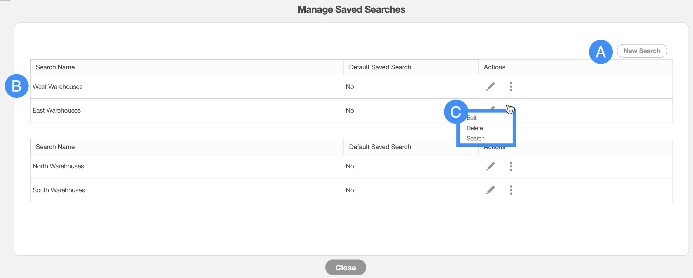 Saved searches are a powerful search tool where the search-criteria has been saved for future use. The default saved search for Warehouses is the "Show All" search.