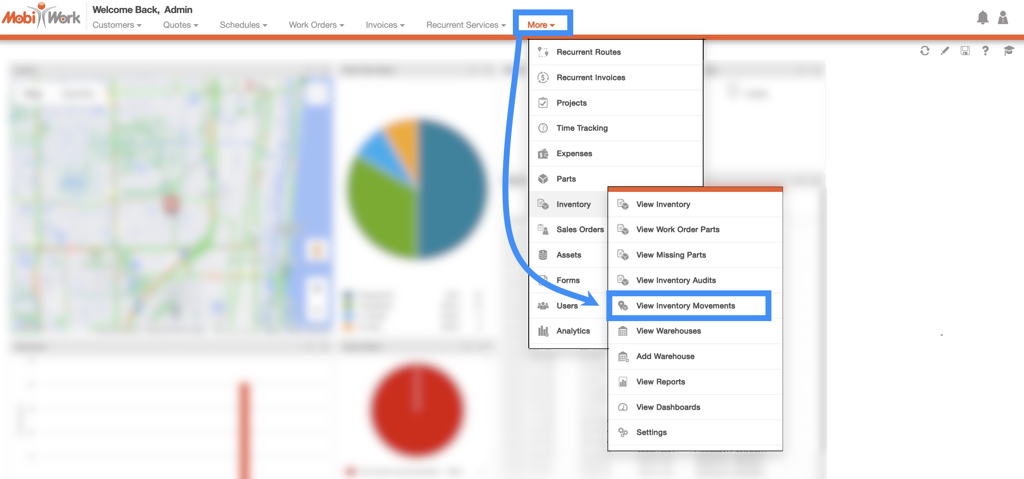 You can access the Warehouses feature page by hovering over the Inventory icon from your MobiWork menu and clicking on the "View Warehouse" option:
