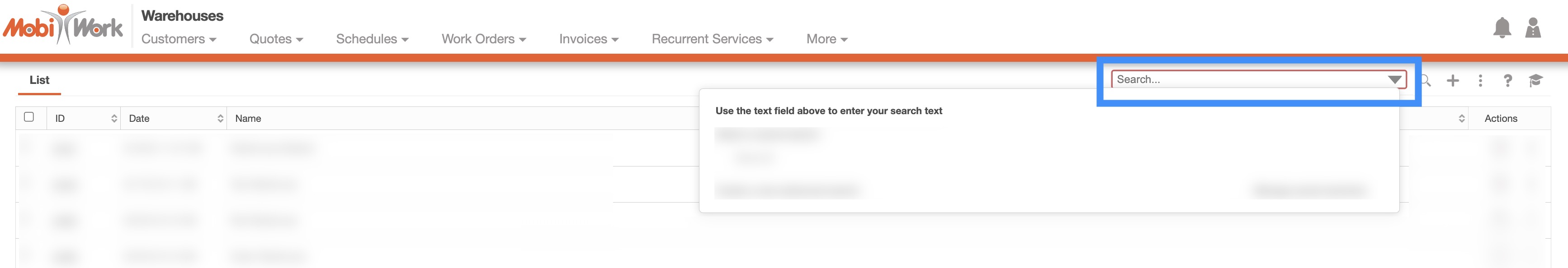 You can type in the search bar (free-text search) to locate a specific warehouse. Once you click in the search bar, the search drop-down menu will automatically appear. You can use the search drop-down menu or continue typing your own search parameters: