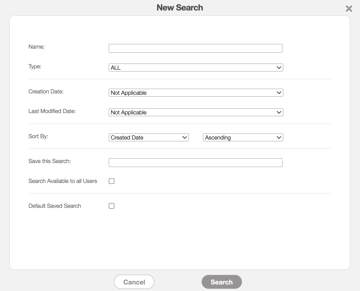Once you have finished inputting the required information, you can save the search, make it available to all users, or make it your default search: