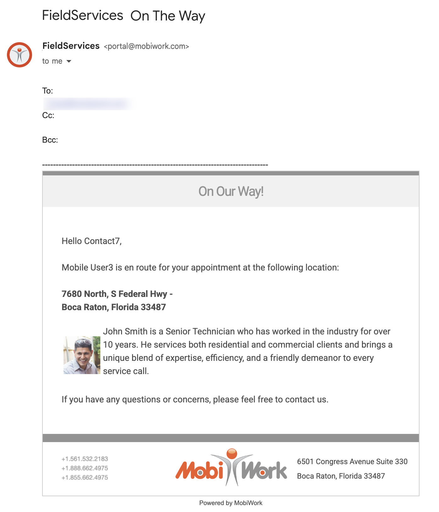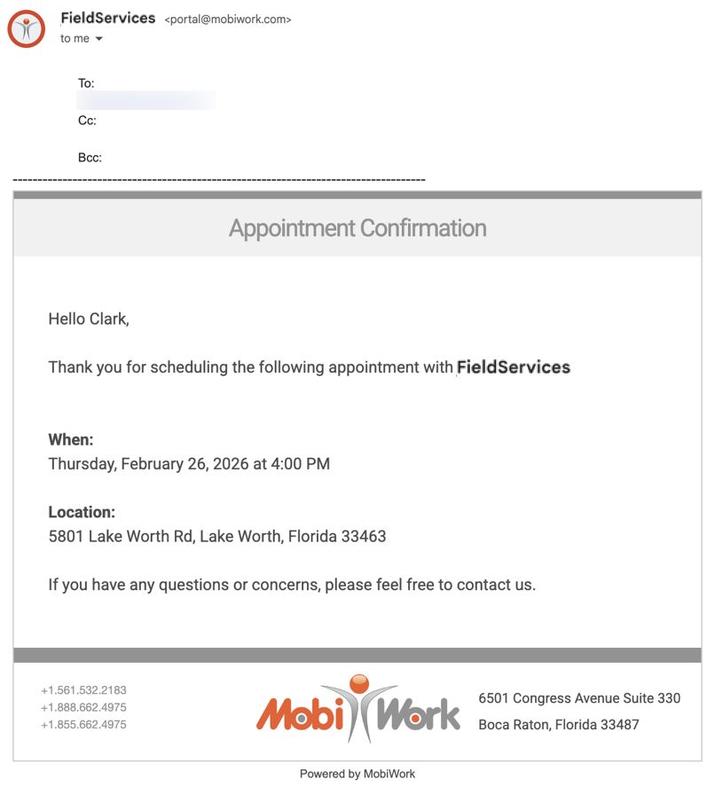MobiWork has a preconfigured MobiRule that will allow you to send an automated "Appointment Confirmation" message to your customer. This message will send once the work order is assigned and dispatched to a technician or user with the specified date and time: