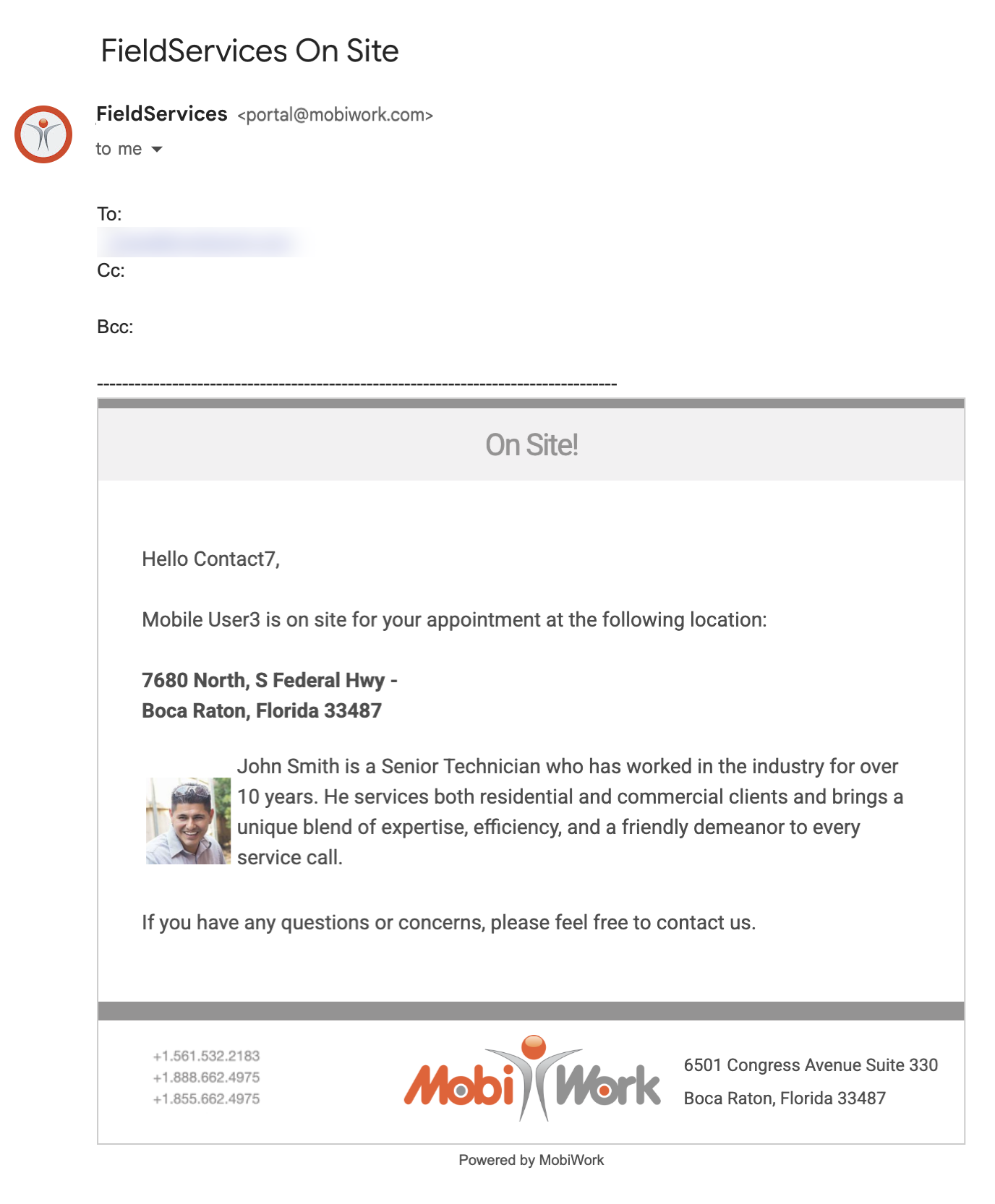 Once the "On Site" Action Item is selected on the device, the automatic on site notification will be sent to the customer: