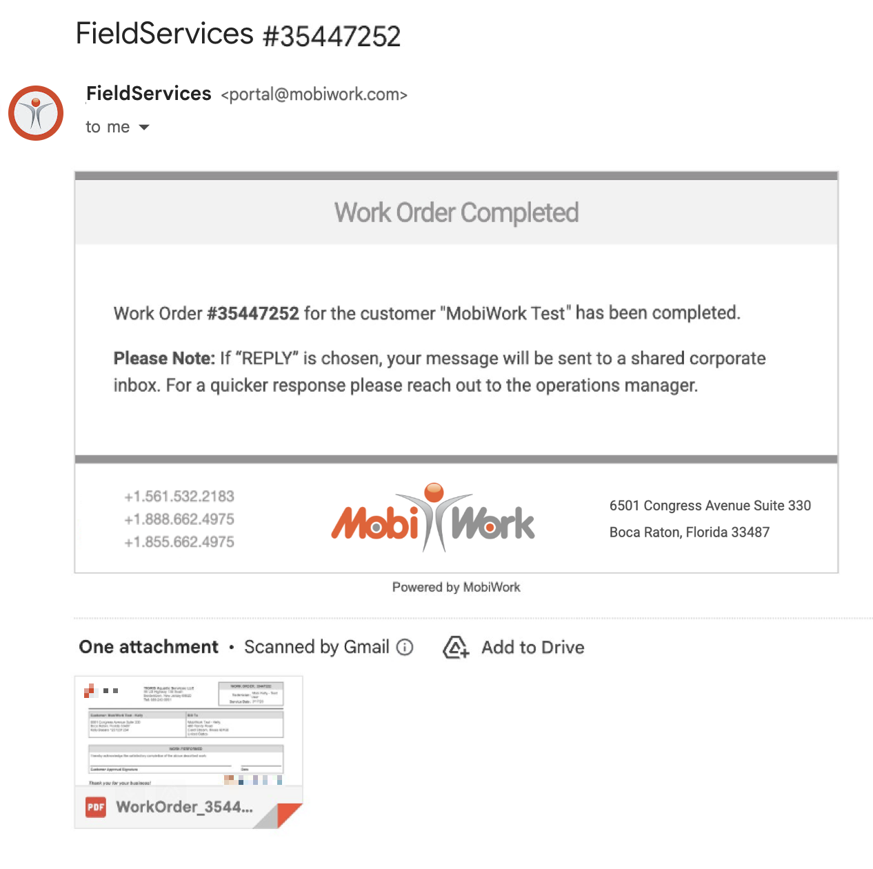 Once the work order is marked as "Complete" or "Closed," the customer will automatically receive a notification confirming that the work has been completed: