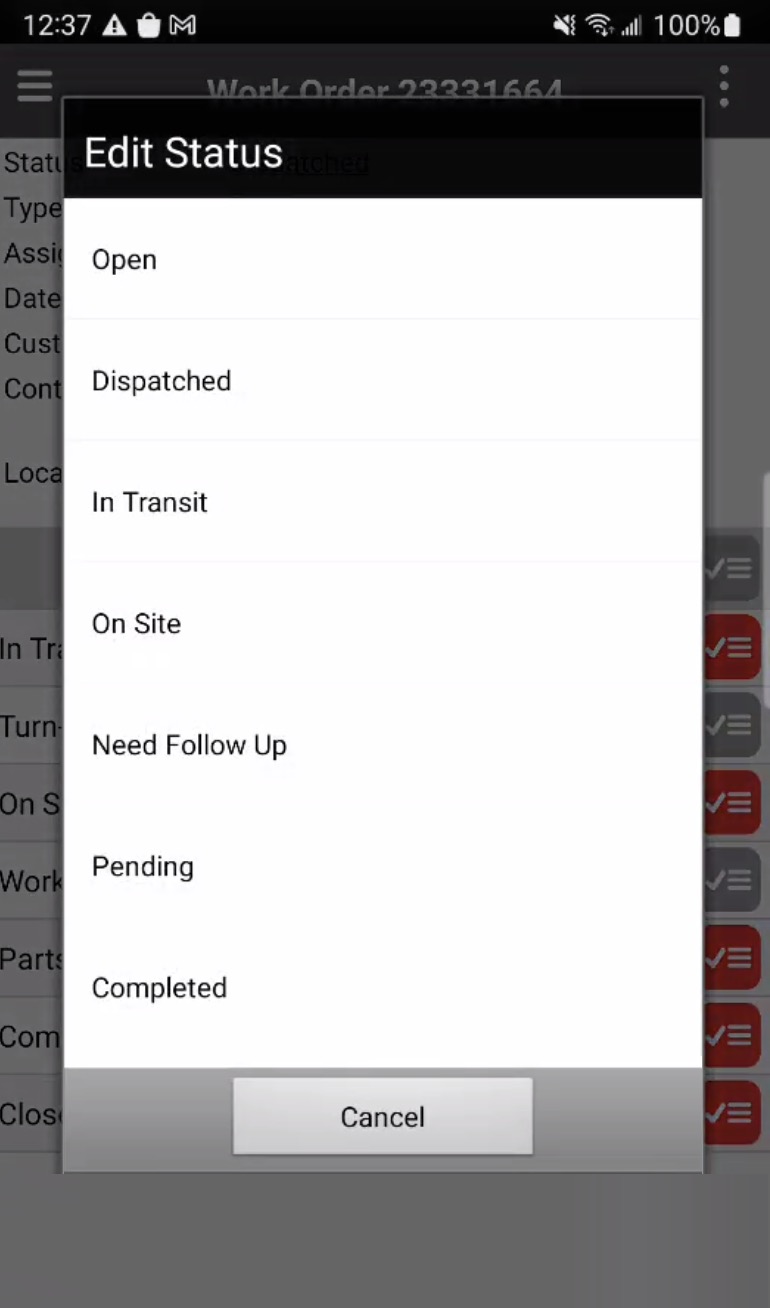 The work order status. To select a new status, press the desired status and the work order's status will then automatically update to the selected status:
