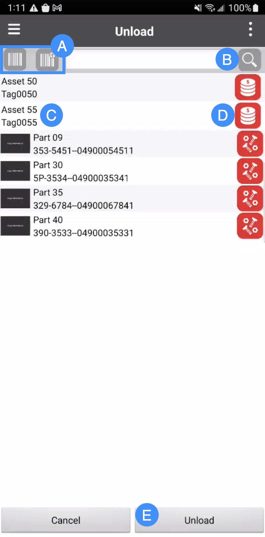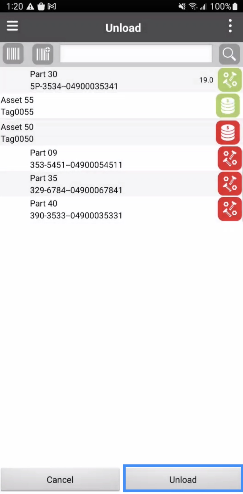 The Unload page will display all the parts and assets that have been loaded (regardless of the day that they were loaded); on this page you can also locate a specific asset or part to unload:
