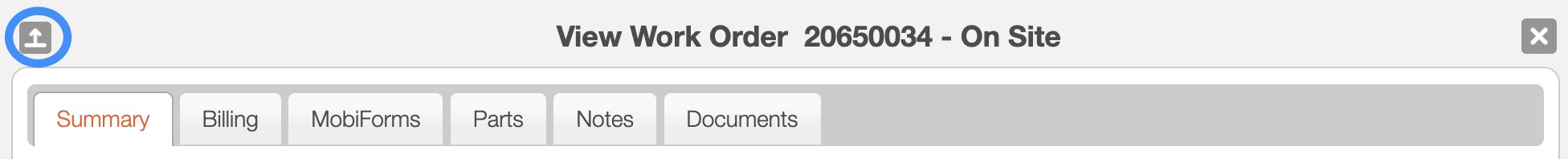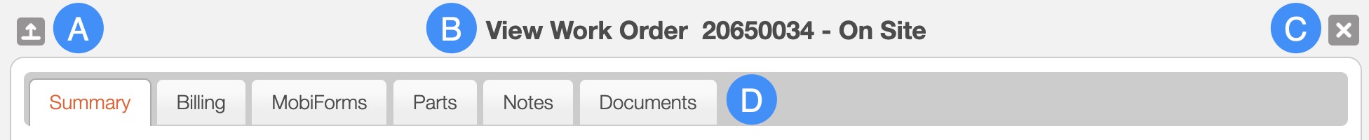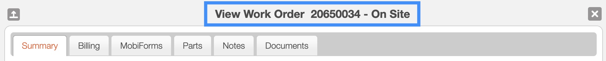 The "Summary" tab is the default tab that will open once the customer accesses the View Work Order pop-up window: