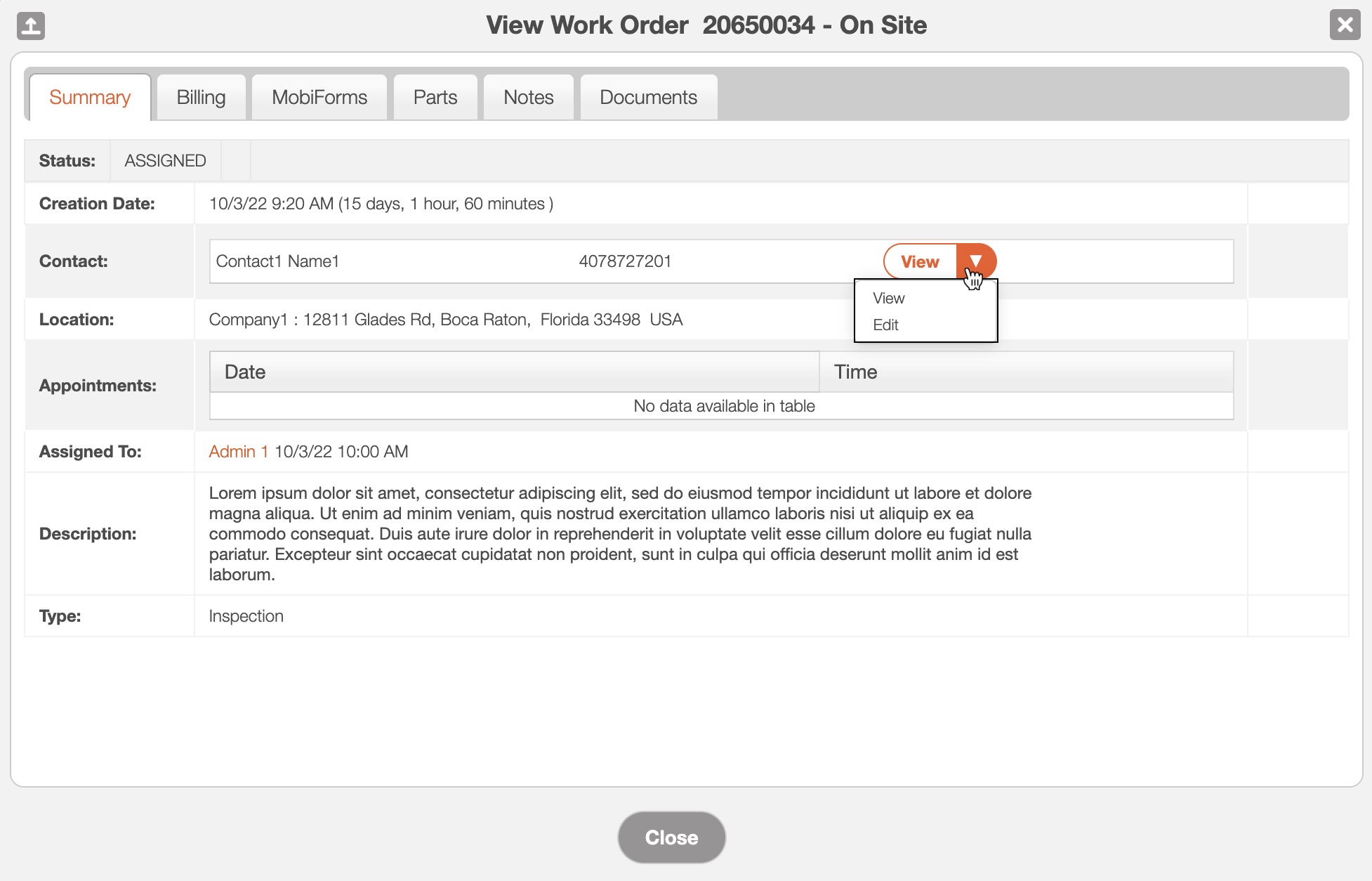 View the customer contact associated with the work order (by clicking on the drop-down from the View button, the customer will be able to edit or view the default contact)