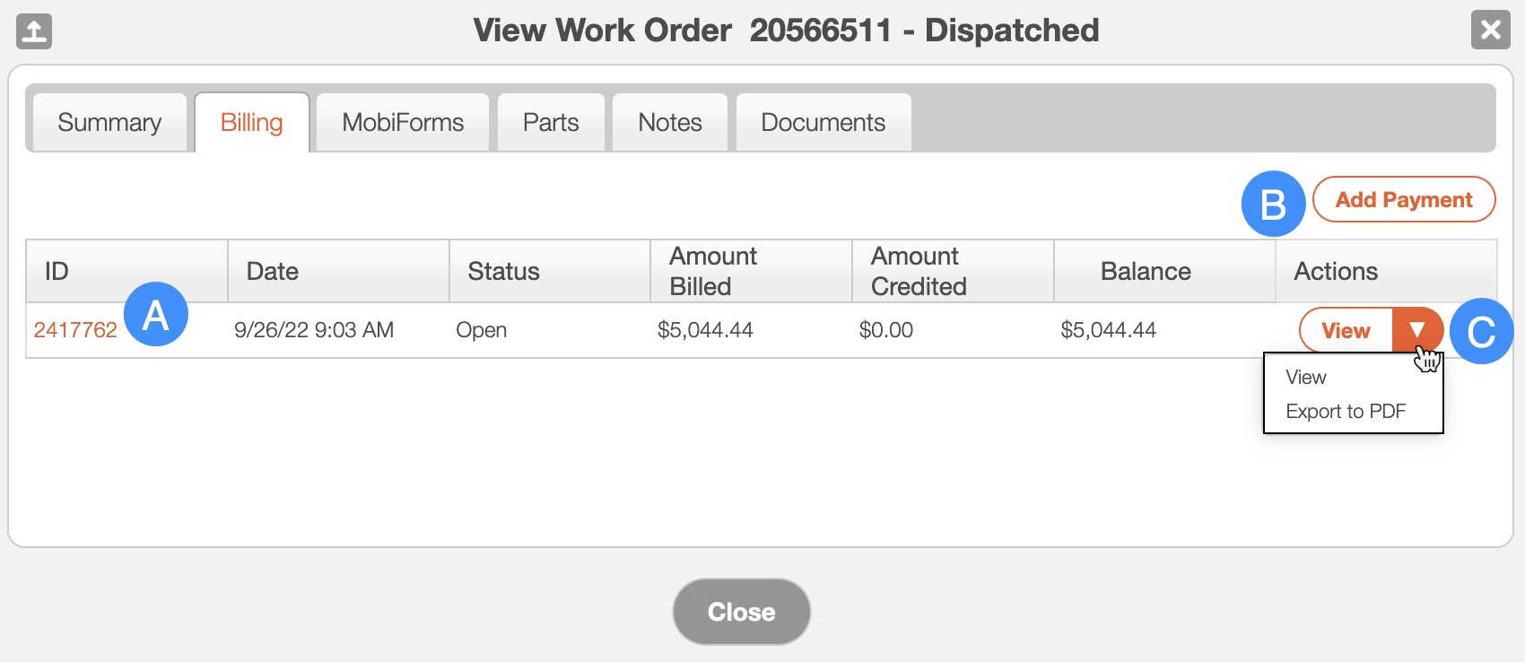 The "Billing" tab will allow the customer to view any bills or invoices associated with the work order. From this tab, the customer will be able to add payments to any outstanding bills or even export the invoice into a PDF file: