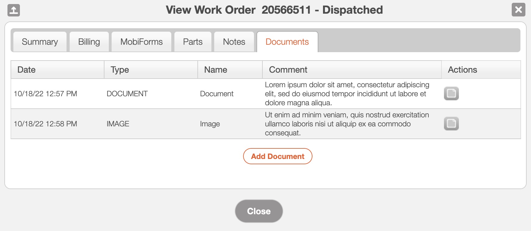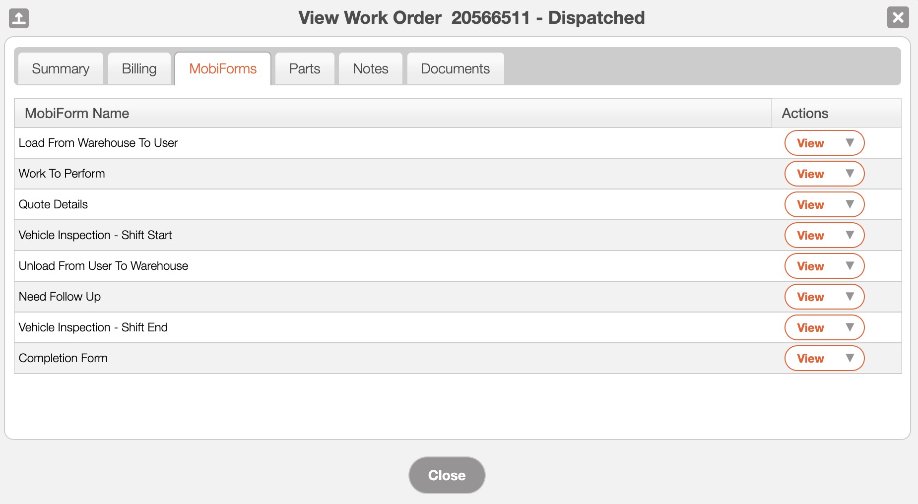 The "MobiForm" tab will allow the customer to view the MobiForms associated with the Work Order: