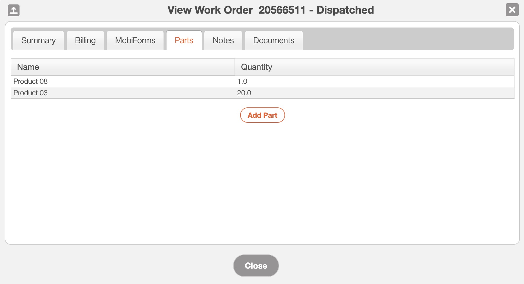 By clicking on the upwards arrow in the left-hand corner, the customer can expand the View Work Order pop-up window so that it is full-size: