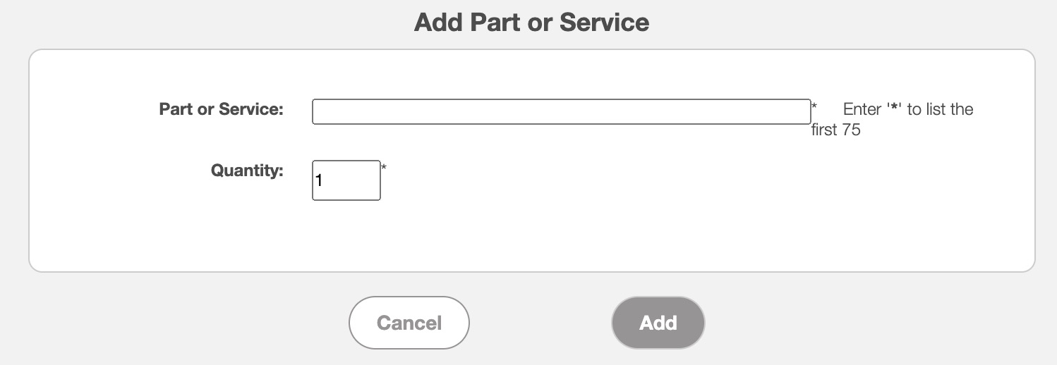 To add a new part/service, the customer should click the Add Part button; the Add Part or Service pop-up window will then appear.