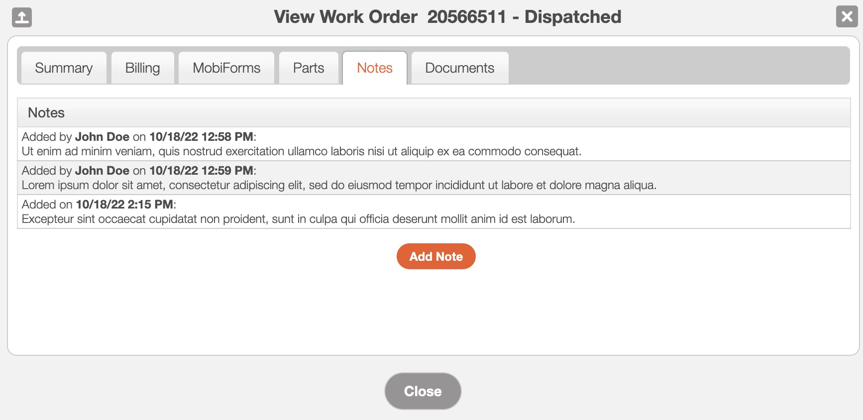 The "Notes" tab will allow the customer to add or view any notes associated with the work order. In order for a customer to add a new note, the customer should click the Add Note button: