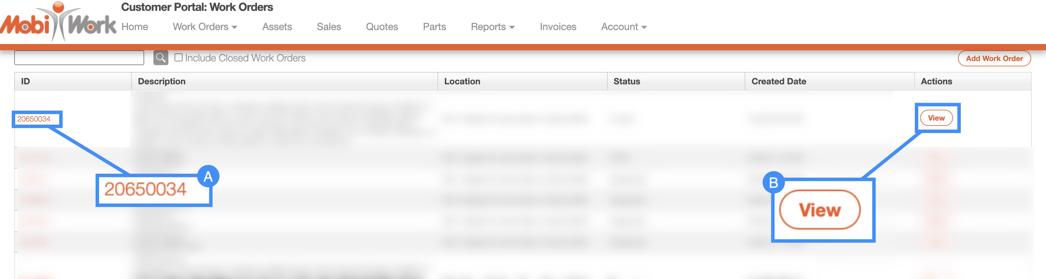 There are several different ways the customer can access the View Work Order pop-up window in the Customer Portal. The methods listed in the subsections below are some of the most straightforward.
