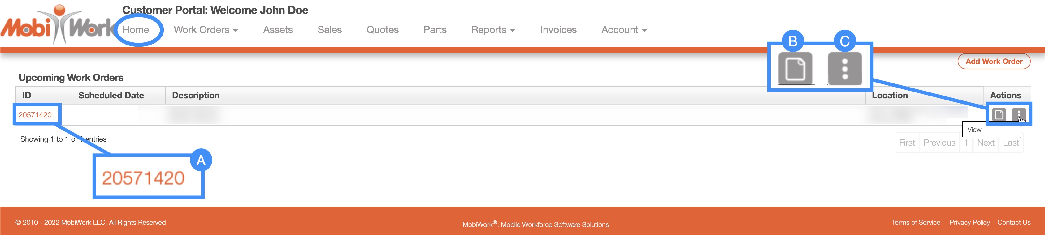 Once the customer is on the Home page, the upcoming work orders will be listed. There are several different ways to access the View Work Order pop-up window from this page: