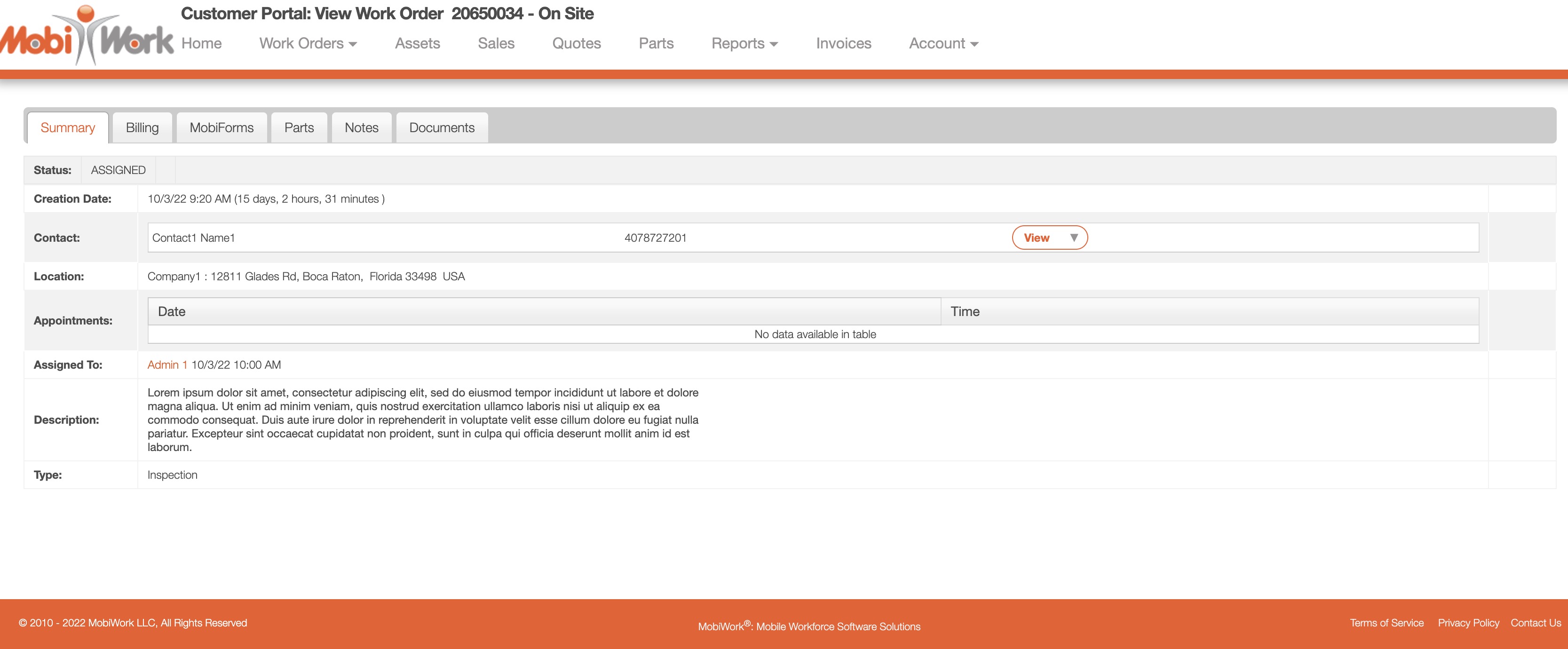 The View Work Order pop-up window has all the information the customer will need regarding their work orders. Once the customer opens the View Work Order pop-up window, they will be automatically directed to the "Summary" tab:
