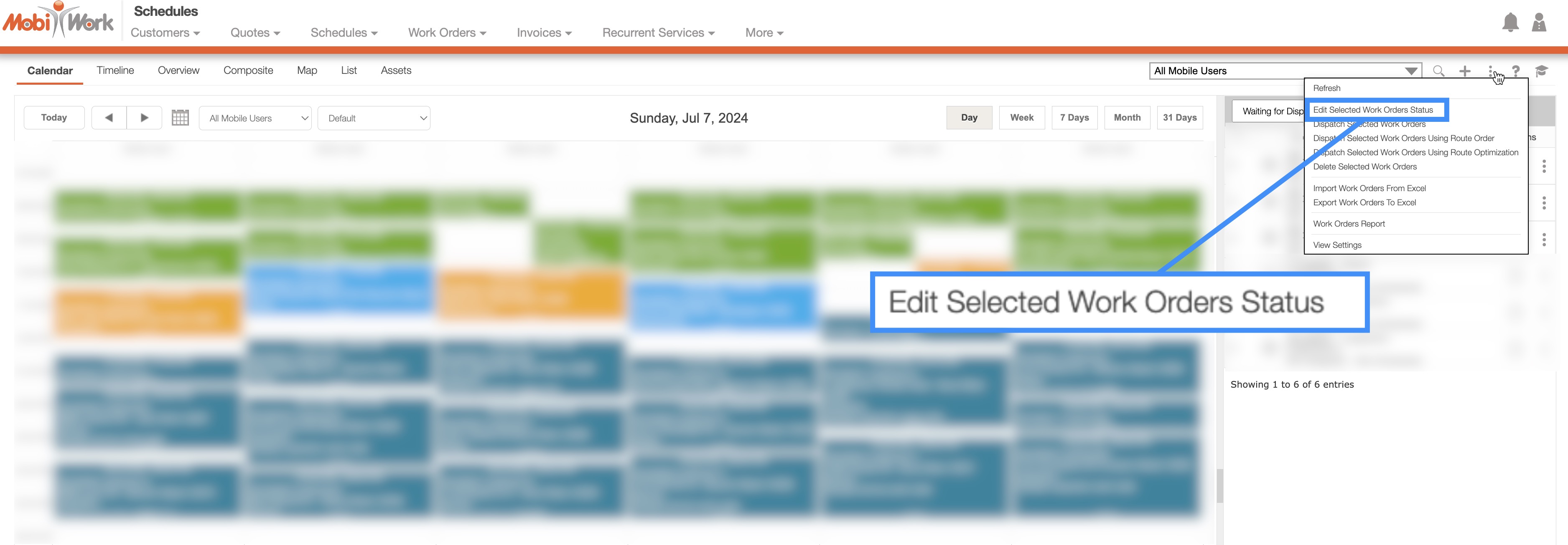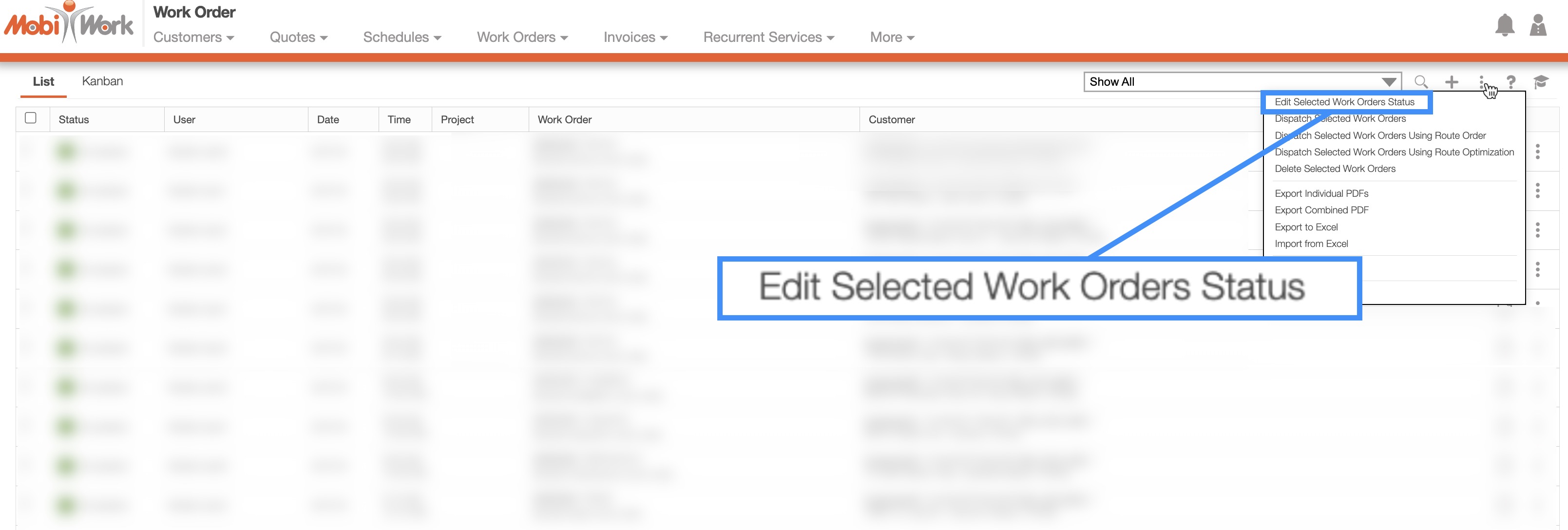 MobiWork allows you to edit multiple work orders at once, thus saving you time from having to update work orders one at a time. You can update multiple work orders in two ways: through the More Actions button or through Excel.