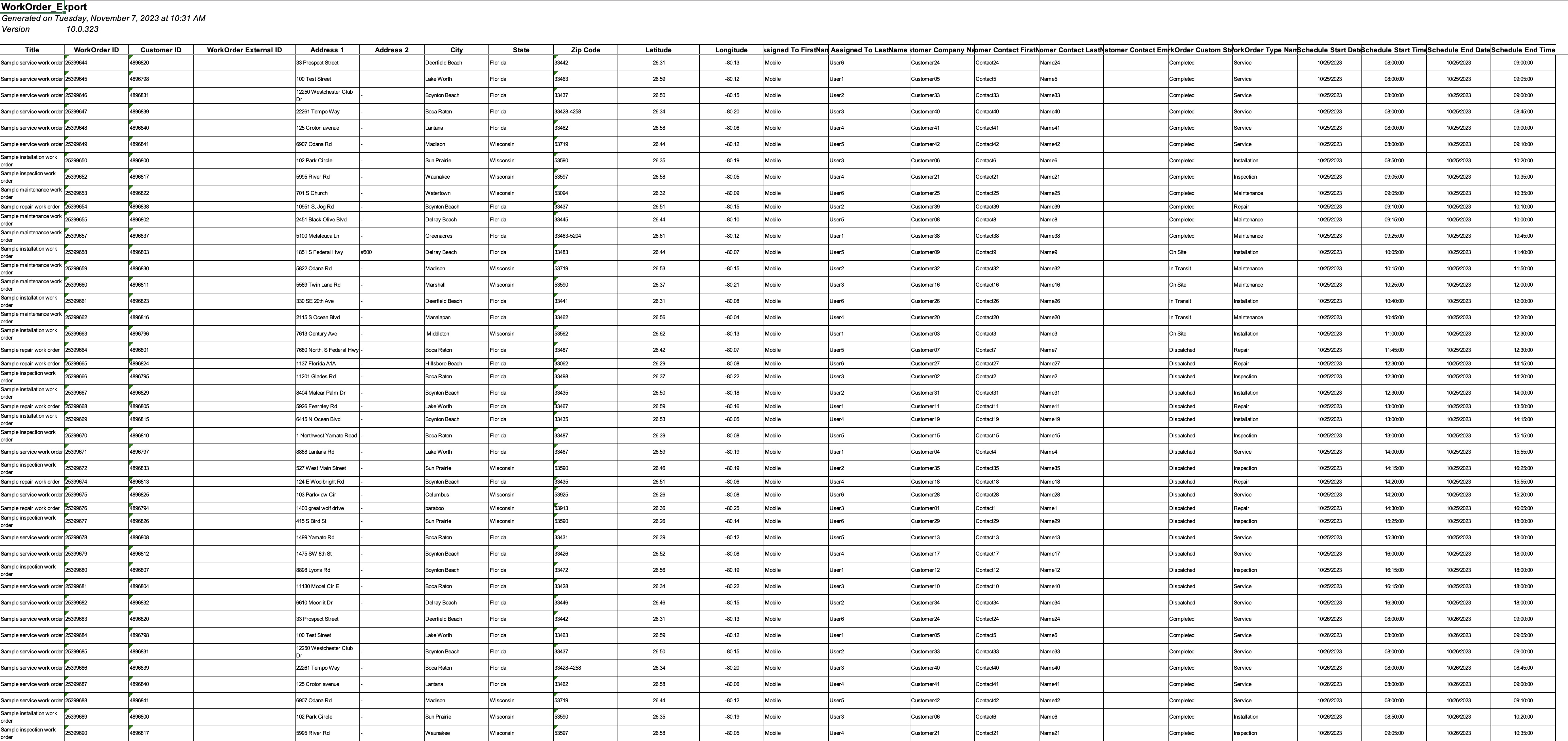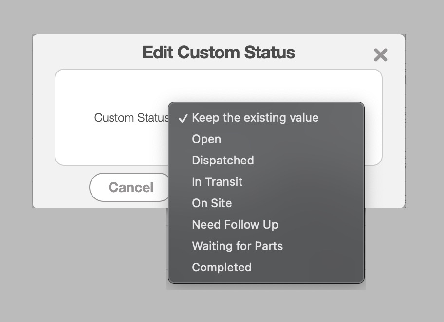| "Status" | The status of the work order (i.e., "Open," "Dispatched," "In Transit," "On Site," "Need Follow Up," "Waiting for Parts," and "Completed"). |