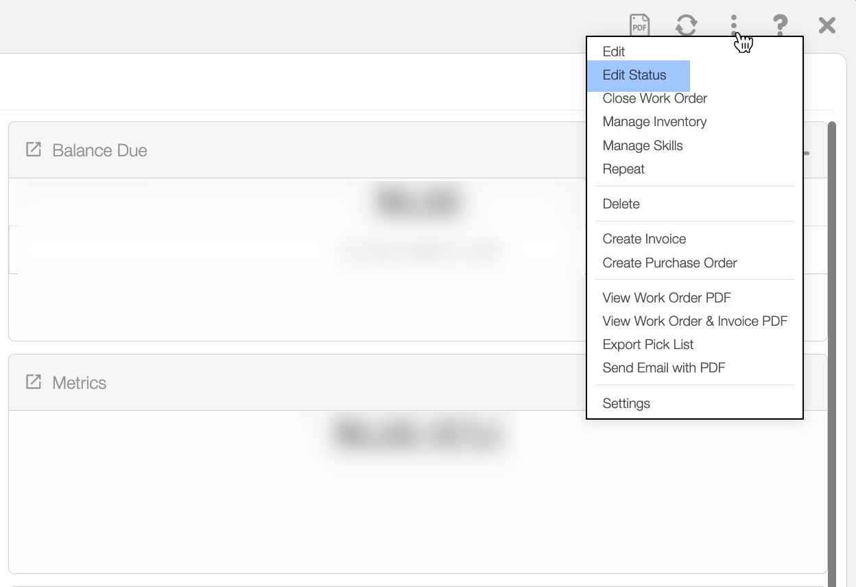 You can modify the status of an individual work order using the View Work Order pop-up window. Or you can also simply click on the Individual Actions button within the pop-up window, and choose the "Edit Status" option from the drop-down menu that appears: