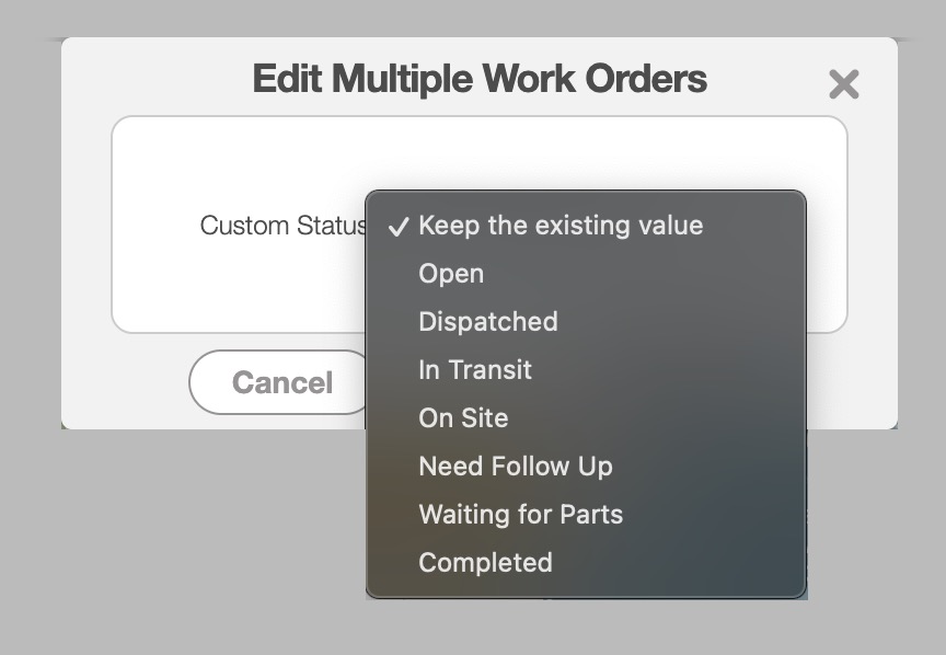 Note: While the pop-up windows may appear different, both the Edit Multiple Work Orders and Edit Custom Status windows will contain identical work order status data.