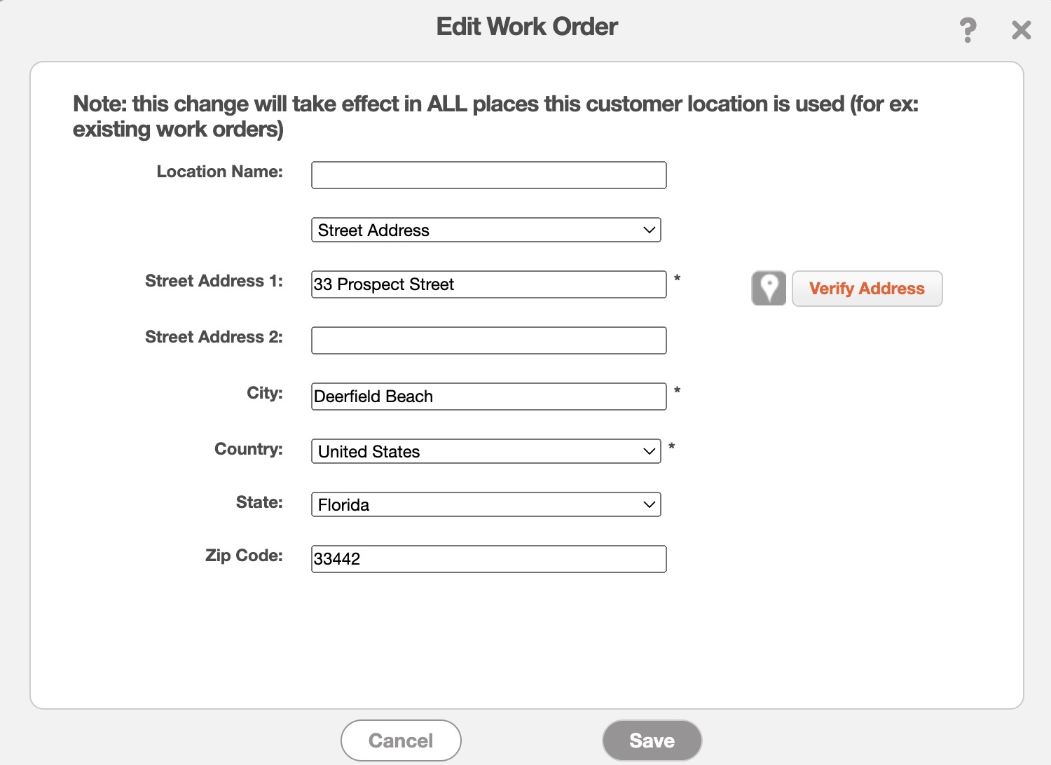 Please note that modifying the location here will result in a global update, affecting the location across various areas where the customer's location is utilized, including existing work orders.