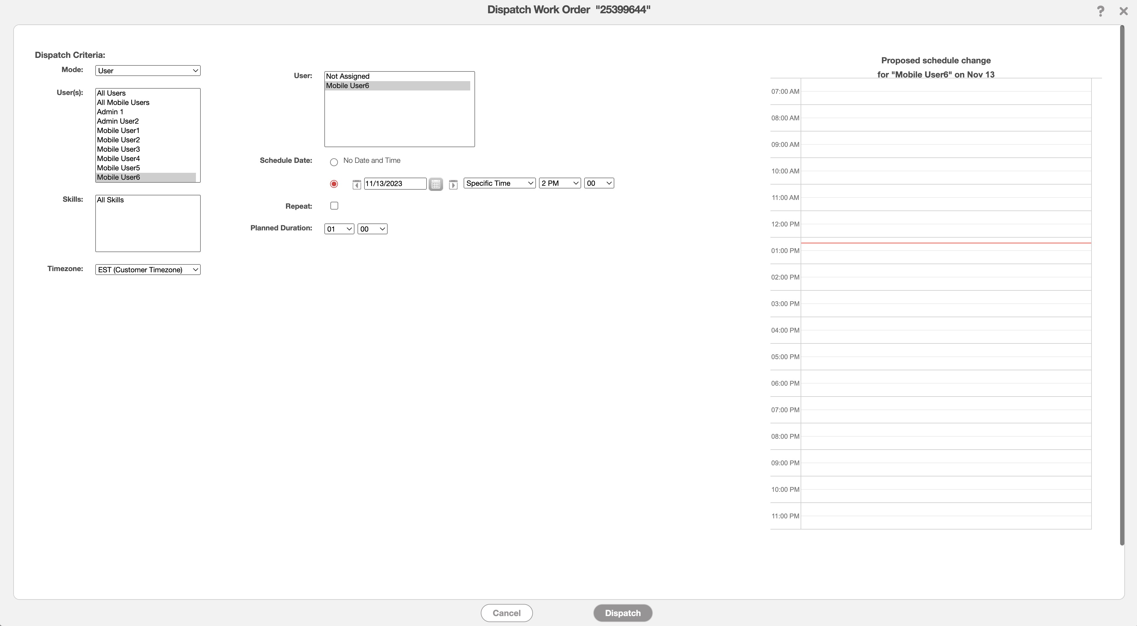 This will open the Dispatch Work Order pop-up window. In this window, you will be able to update the assigned user, the date, and time of the work order: