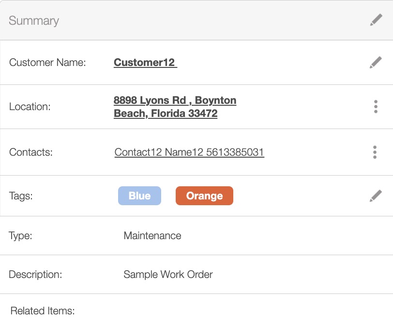 You can also update the customer profile attached to the work order, location, contacts, and tags from the "Summary" panel of the select work order. To edit the desired data, simply click on the respective Pencil icon. The following subsections will demonstrate how to edit the aforementioned information: