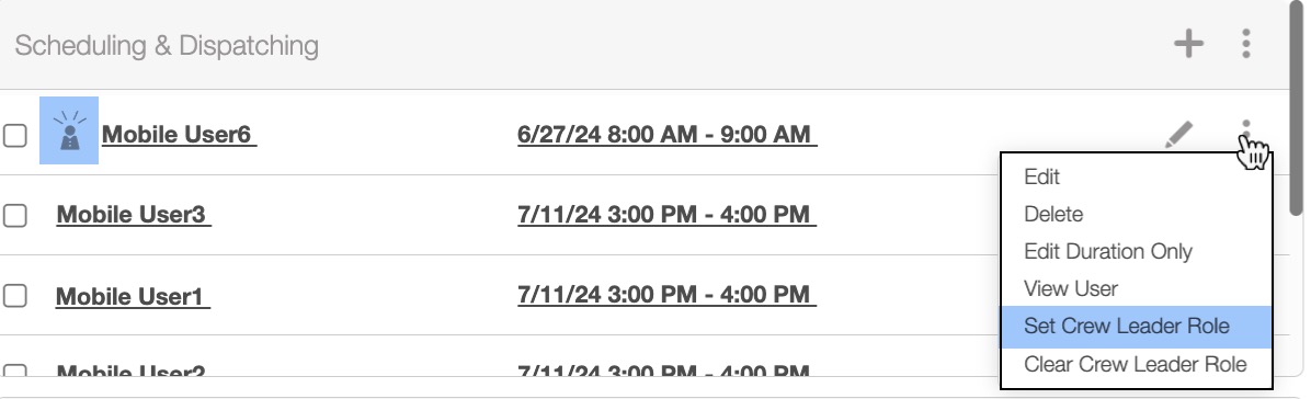 In the "Scheduling & Dispatching" panel, you can access the "Set Crew Leader Role" option by right-clicking or accessing the drop-down menu from the Individual Actions button: