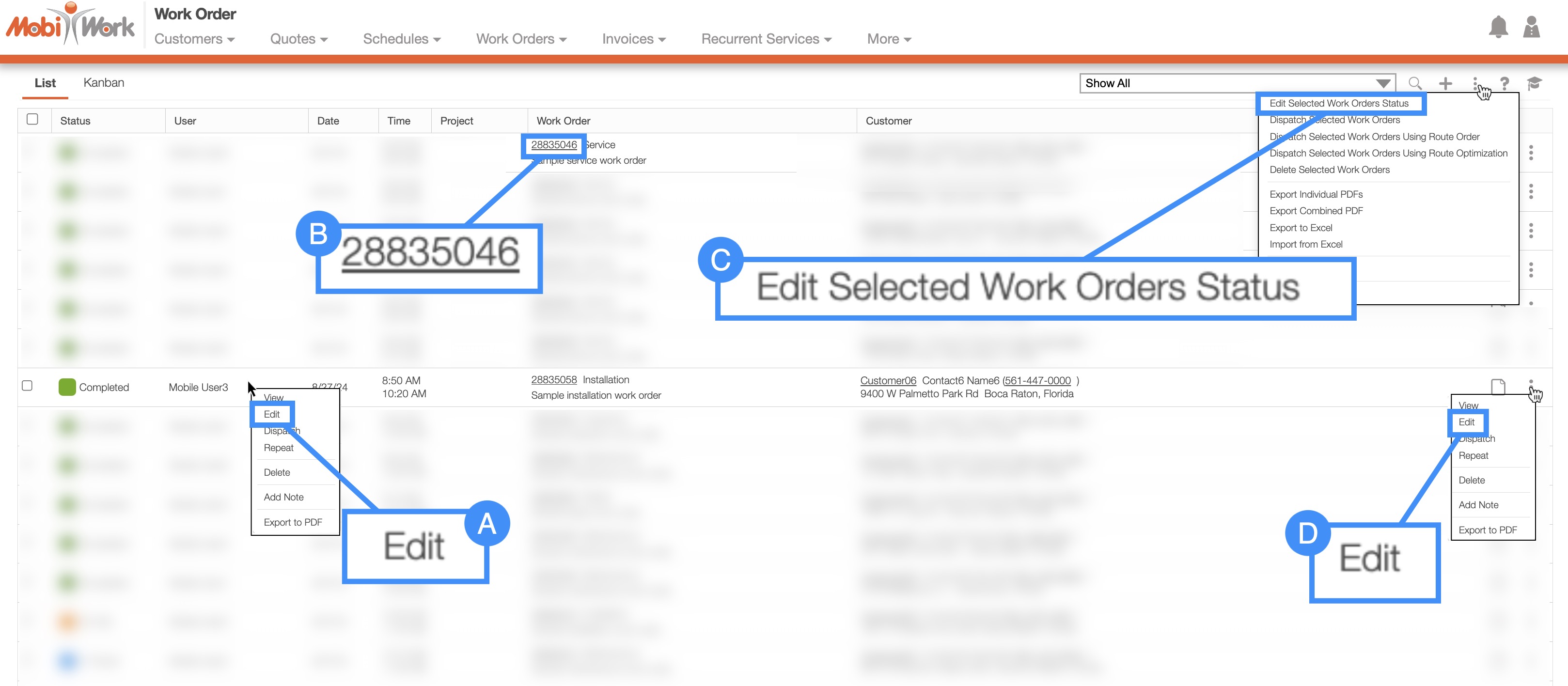 There are several ways you can edit a work order within MobiWork. The subsections below will highlight some different methods on how to edit a work order.