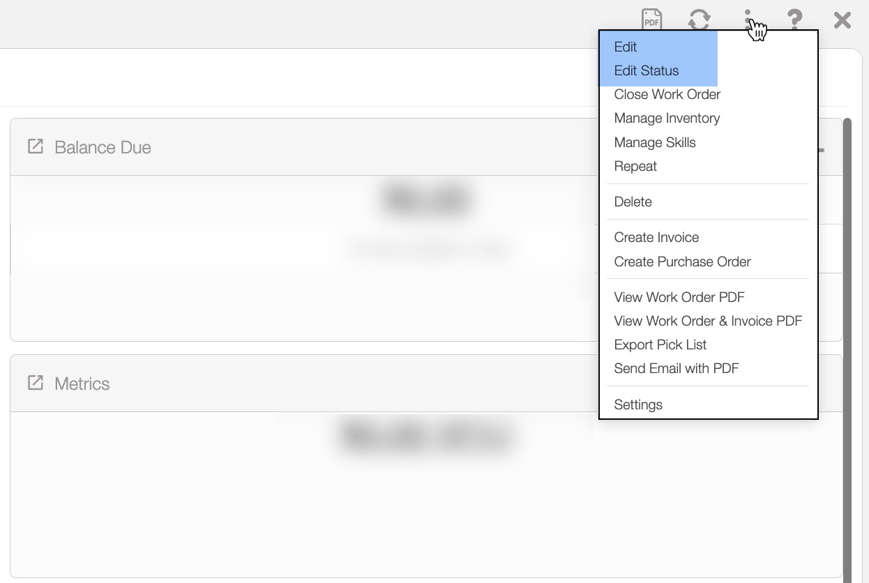 The option to edit a work order is different from editing the status; with the "Edit" option you can update more fields (e.g., not only the status but also the description, the External ID, etc.). Editing the status will only change the status of a selected work order.