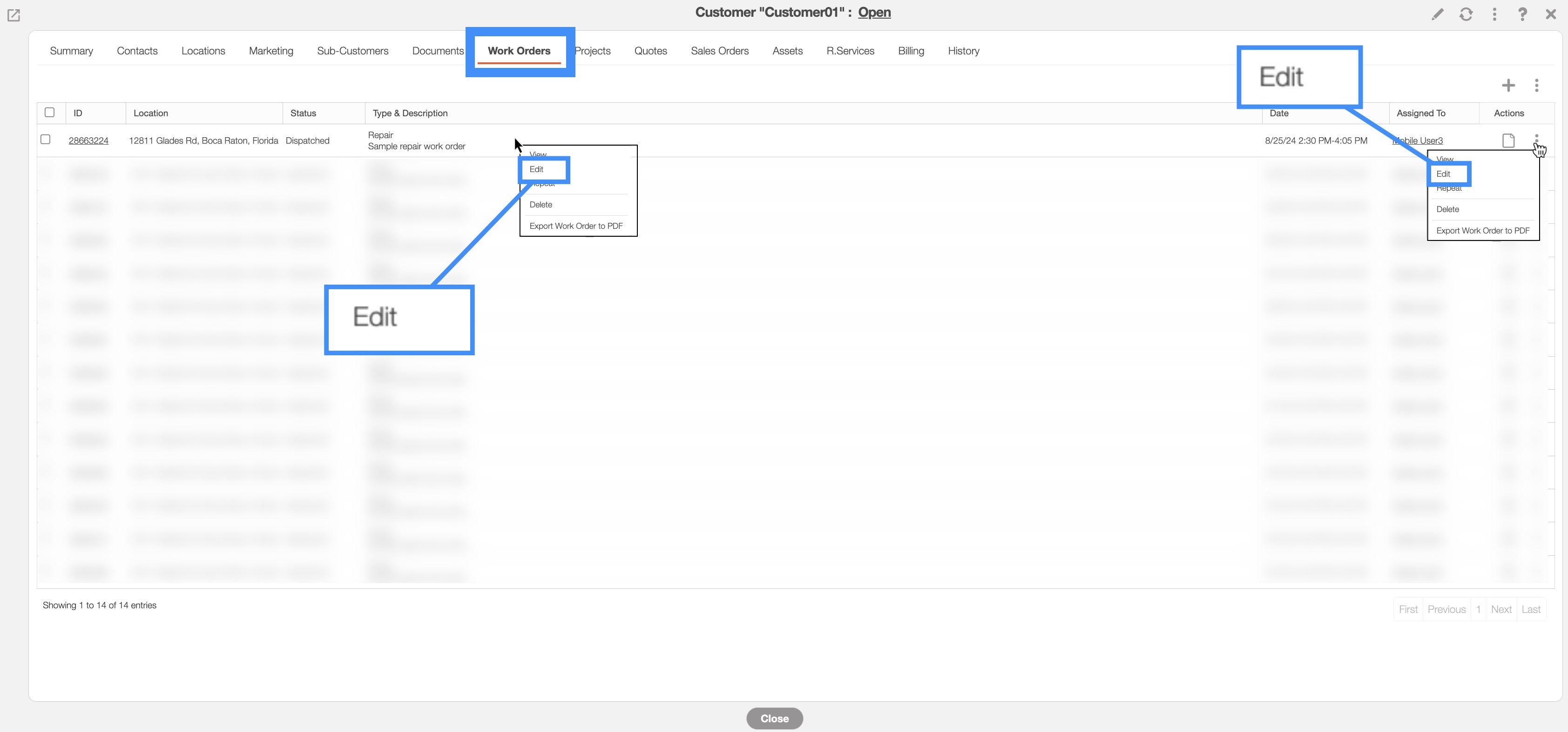 - Once you open the View Customer pop-up window select the "Work Order" tab. On the "Work Order" tab click on the Individual Actions button or right-click on the desired work order, and from the drop-down select the "Edit" option: