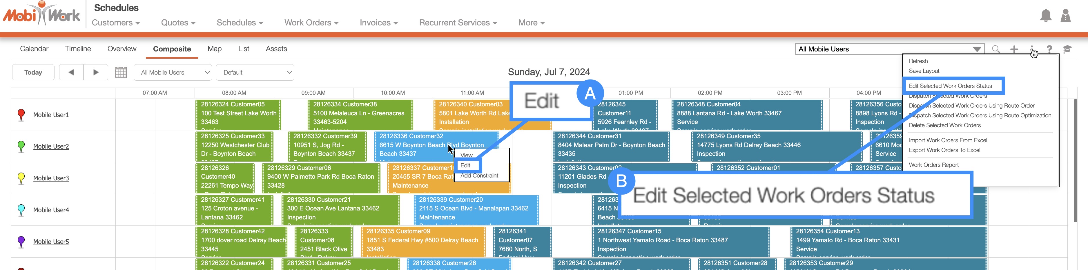 From the Schedules feature, click on the More Actions button and select the "Edit Selected Work Orders Status" option from the drop-down: