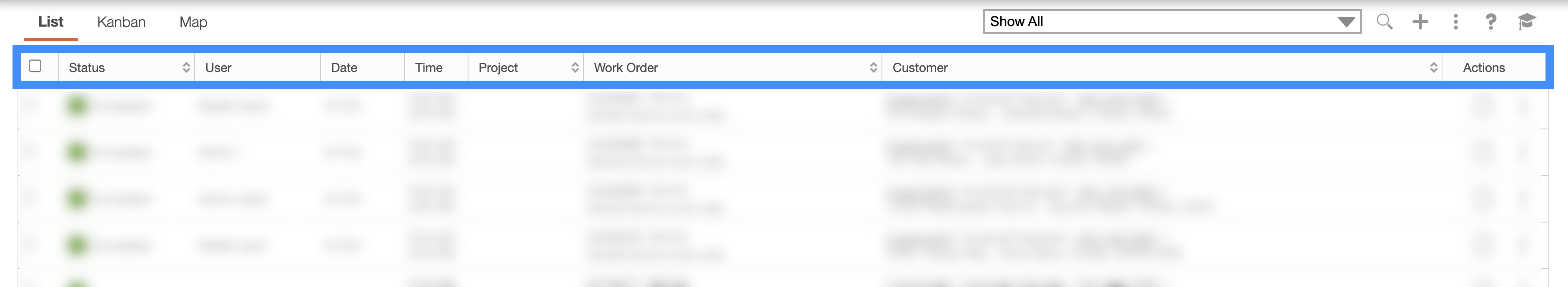 These columns are organized as: "Status," "Users," "Date," "Time," "Project," "Work Order," "Customer," and "Actions:"