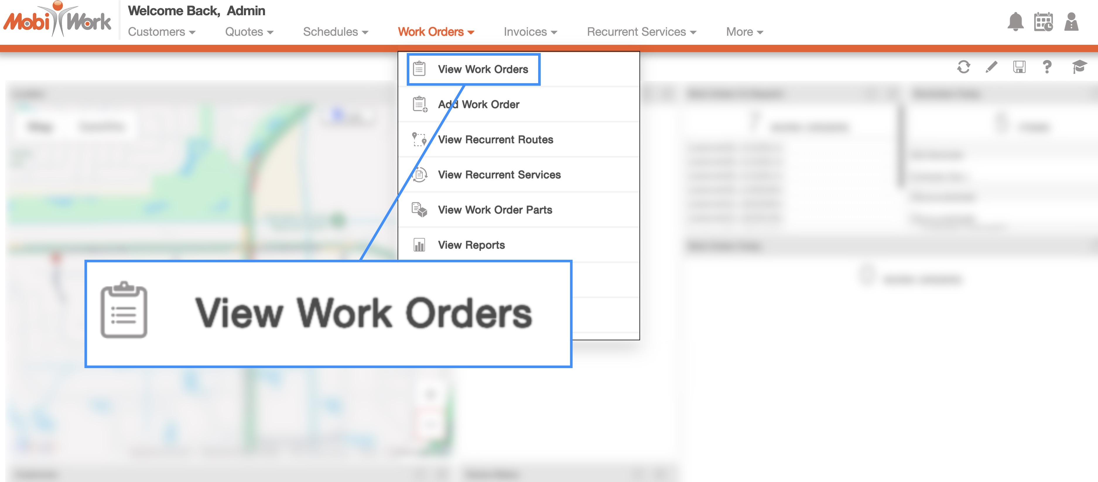 You can access the Work Orders feature page by hovering over the Work Orders feature from your MobiWork menu; from the drop-down that appears click on the "View Work Orders" option: