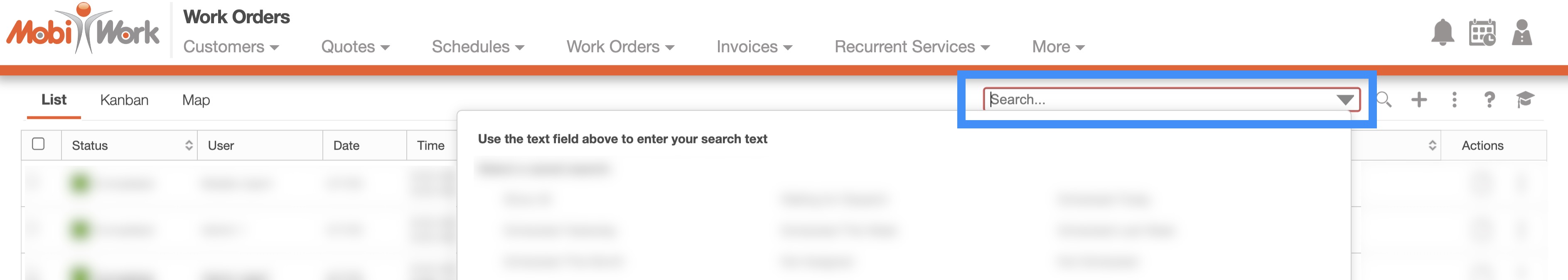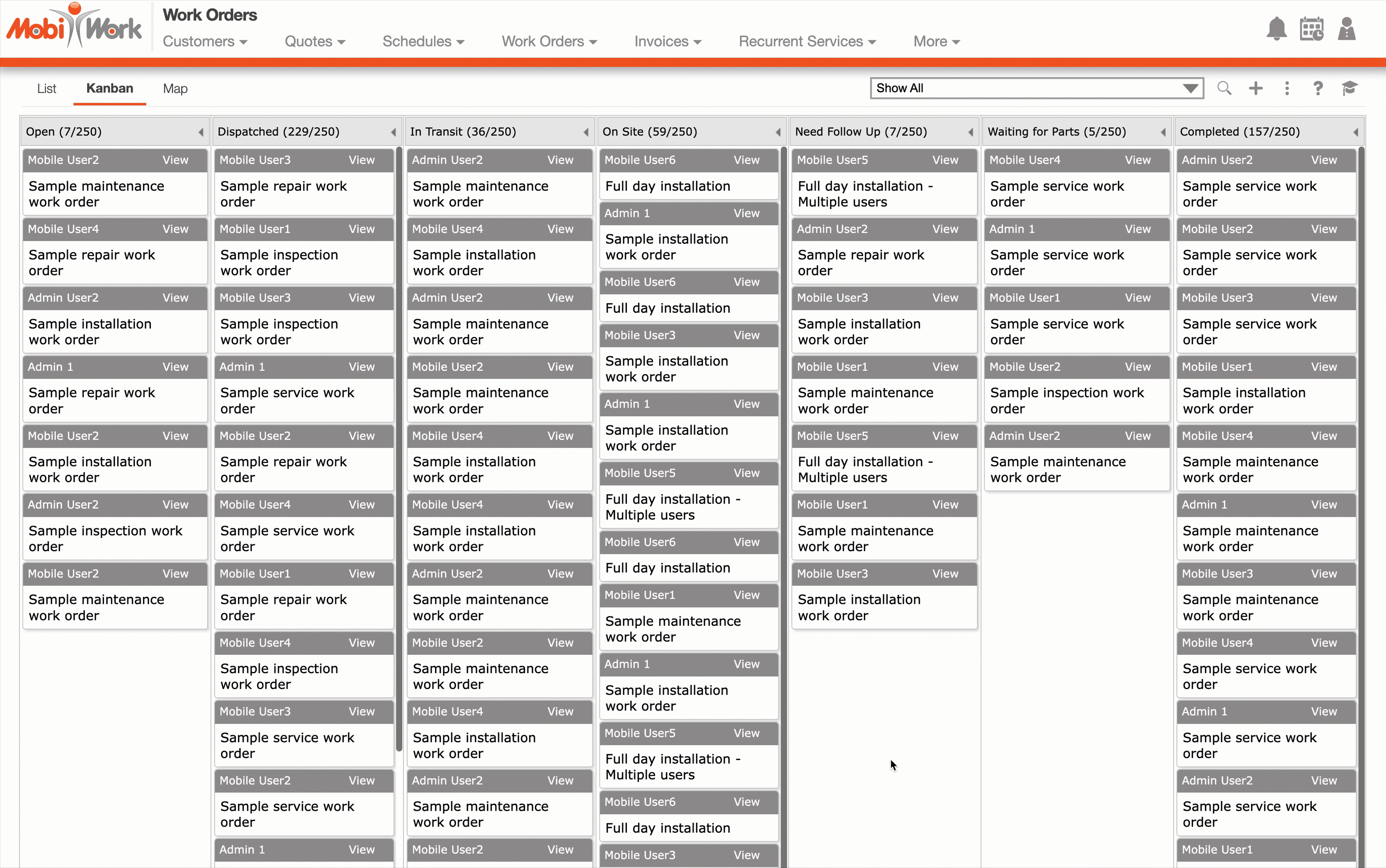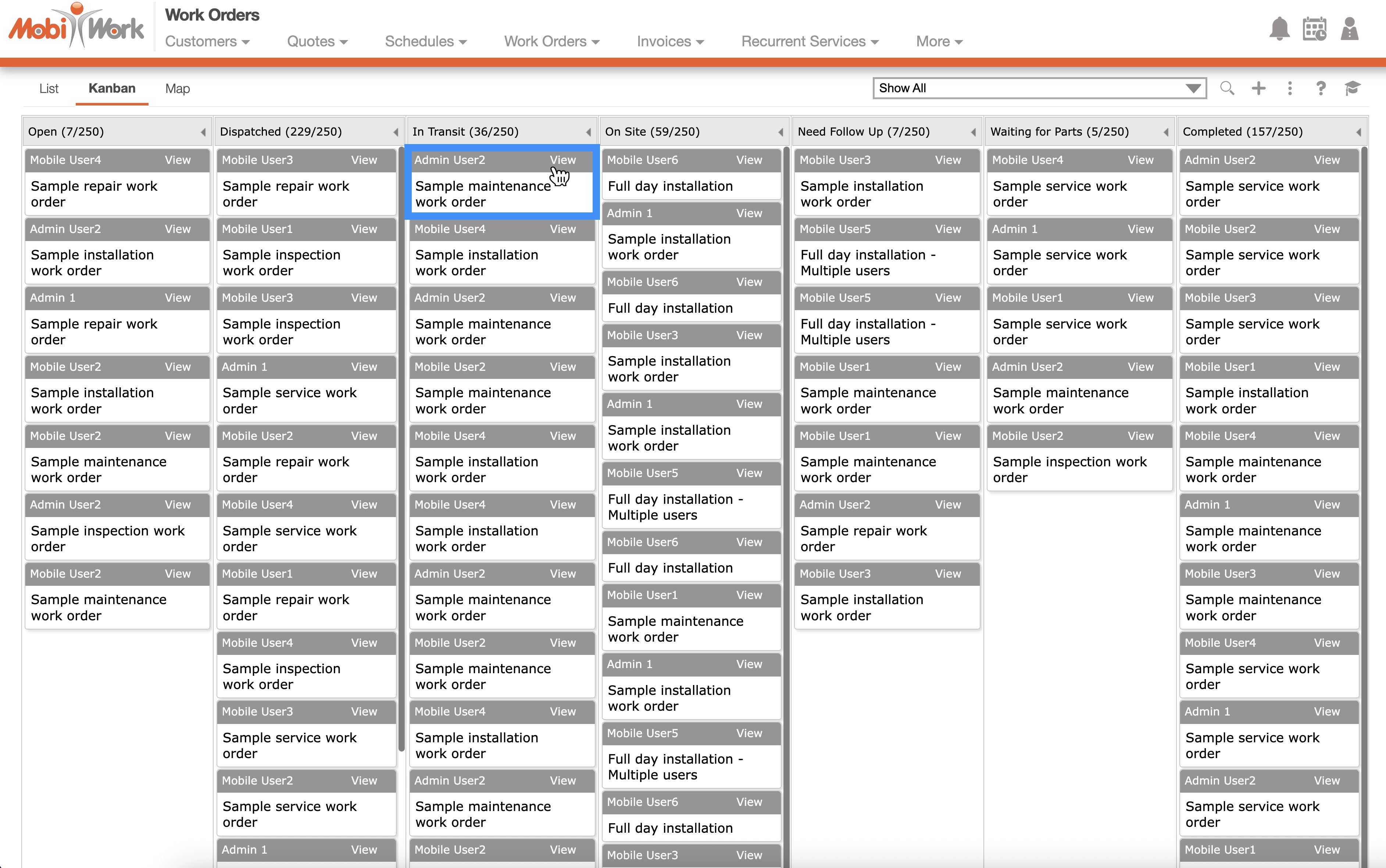 With MobiWork, you will also be able to view the associated user for each work order, thus enhancing your overall management experience. The "List" and "Kanban" tabs found on this page, will allow for efficient organization, viewing, and overall management of your work orders.