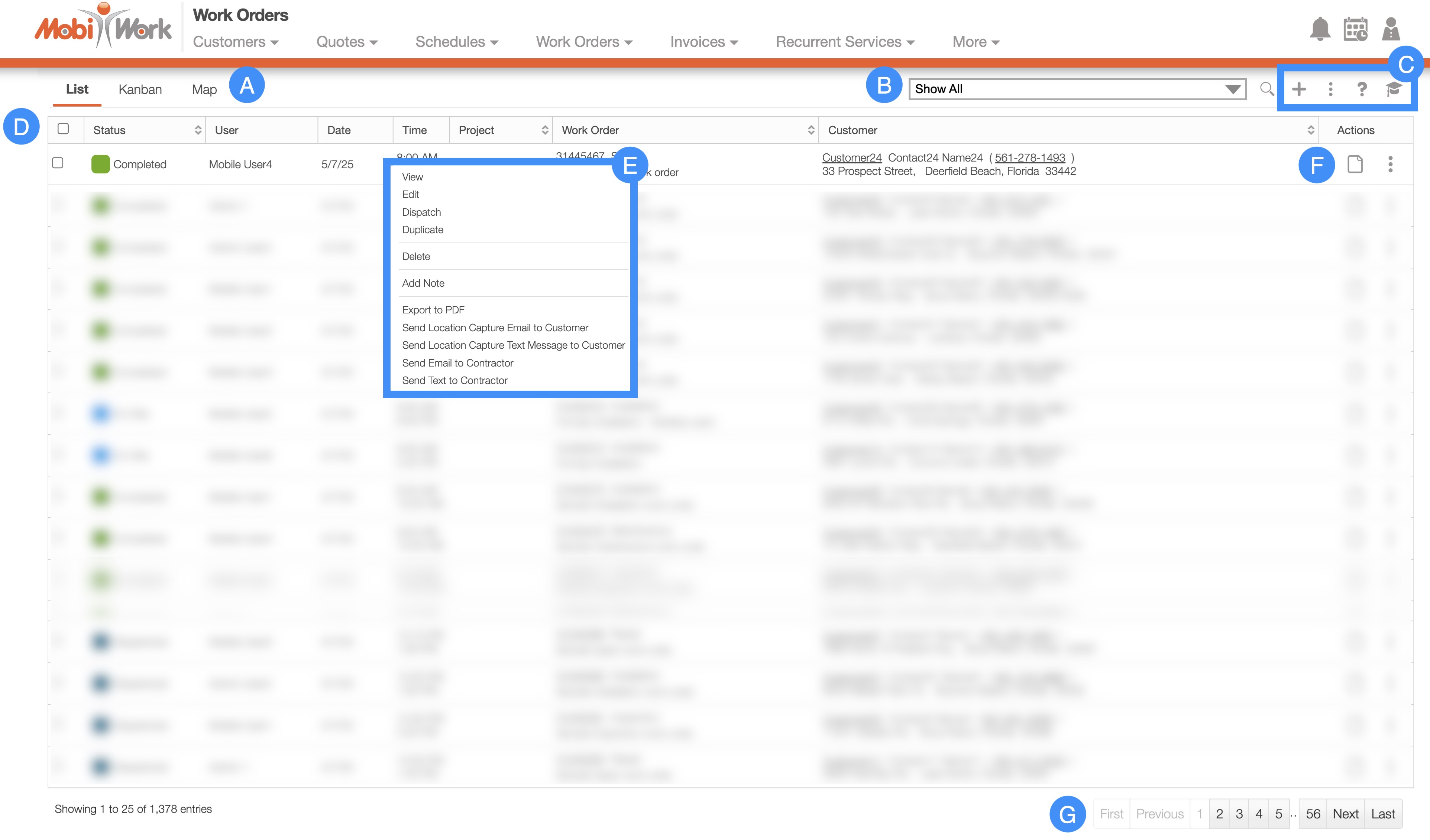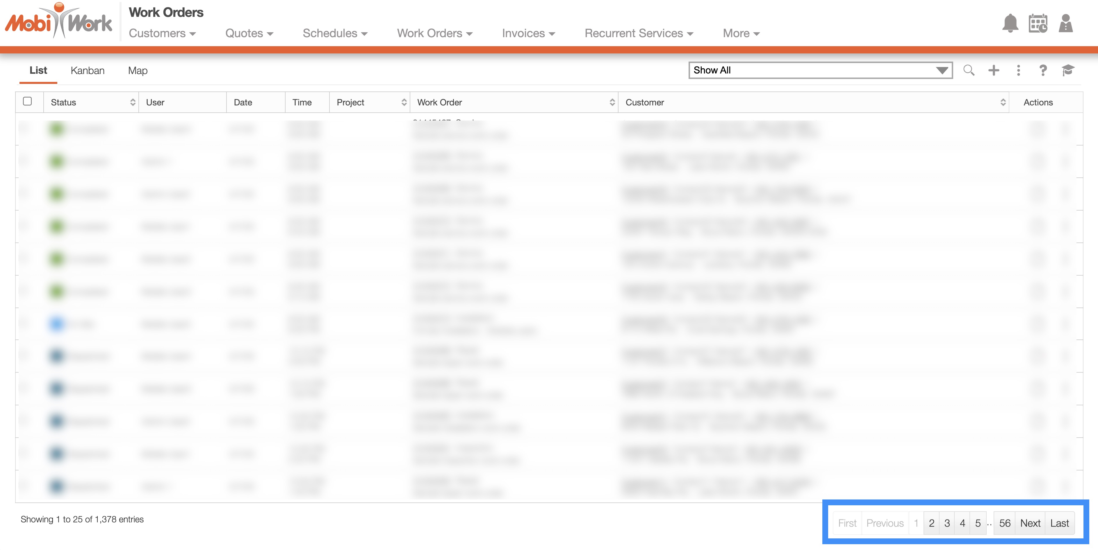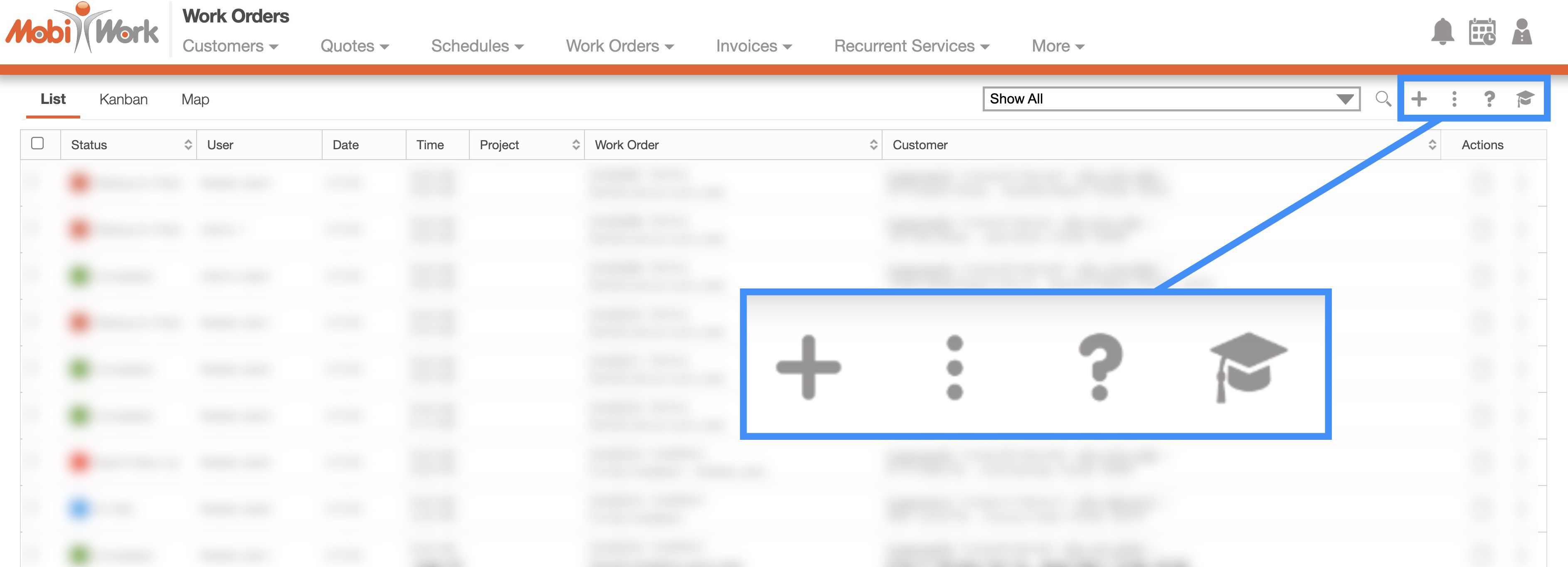 With MobiWork, you will also be able to view the associated user for each work order, thus enhancing your overall management experience. The "List" and "Kanban" tabs found on this page, will allow for efficient organization, viewing, and overall management of your work orders.