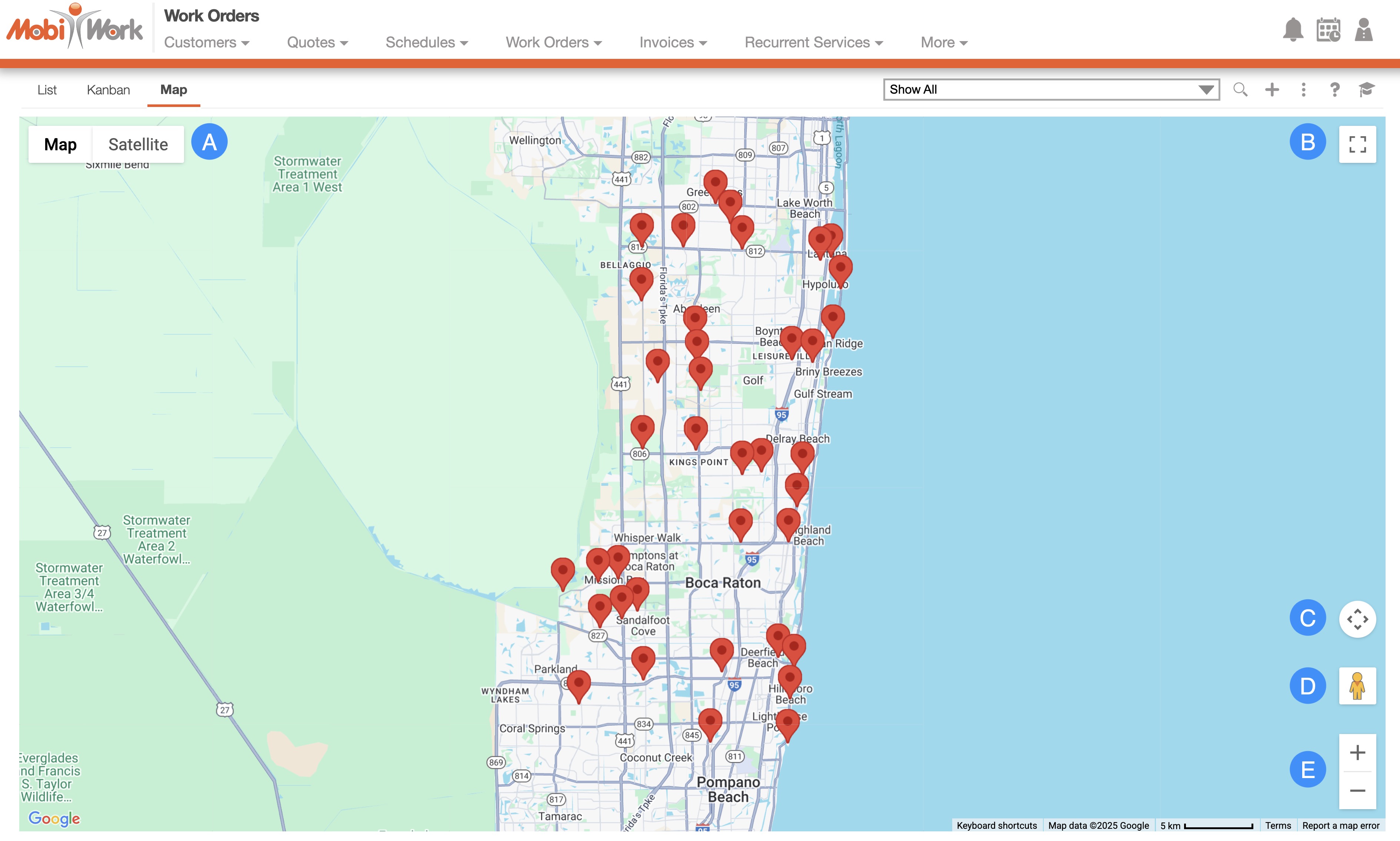 The "Map" tab will visually display all your work orders (represented by pins) on a map. MobiWork utilizes the same map system that is utilized in Google Maps; the buttons and functions will work the same way: