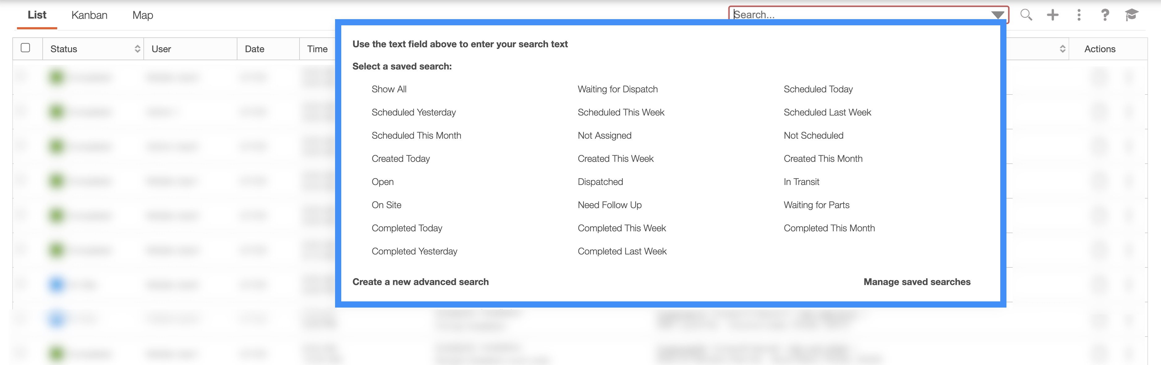 These search functions are consistent across all MobiWork features, with the only differences being the predefined search data and the parameters for the new search. The following subsections will outline the various search features that are available to you.