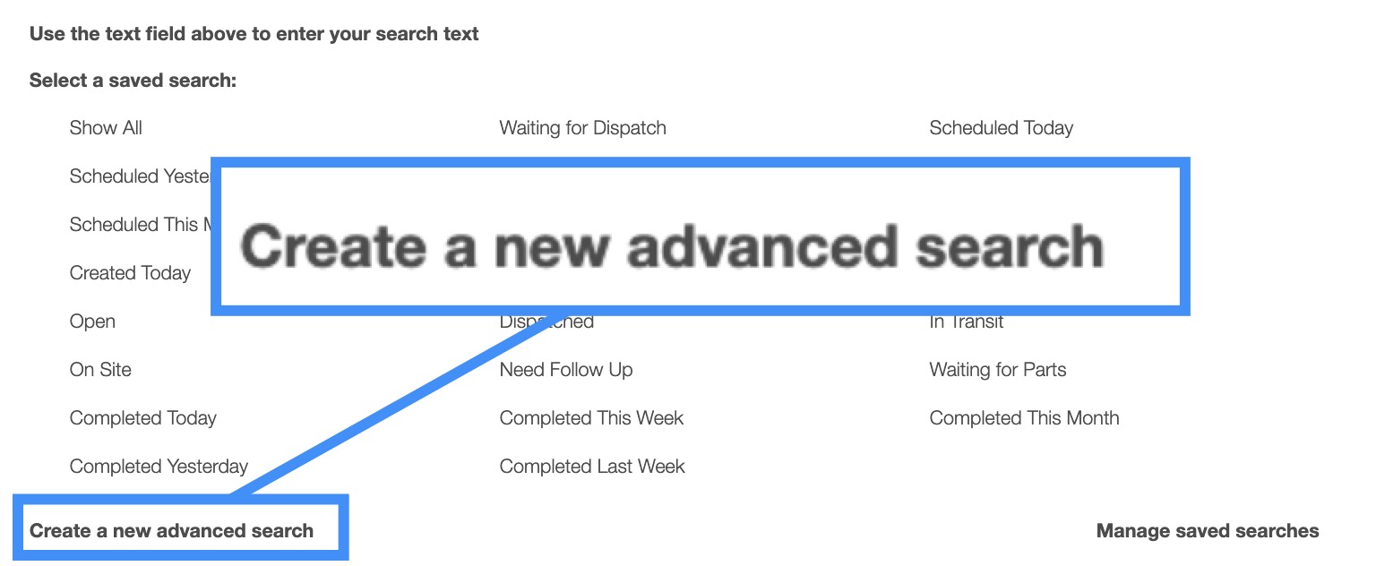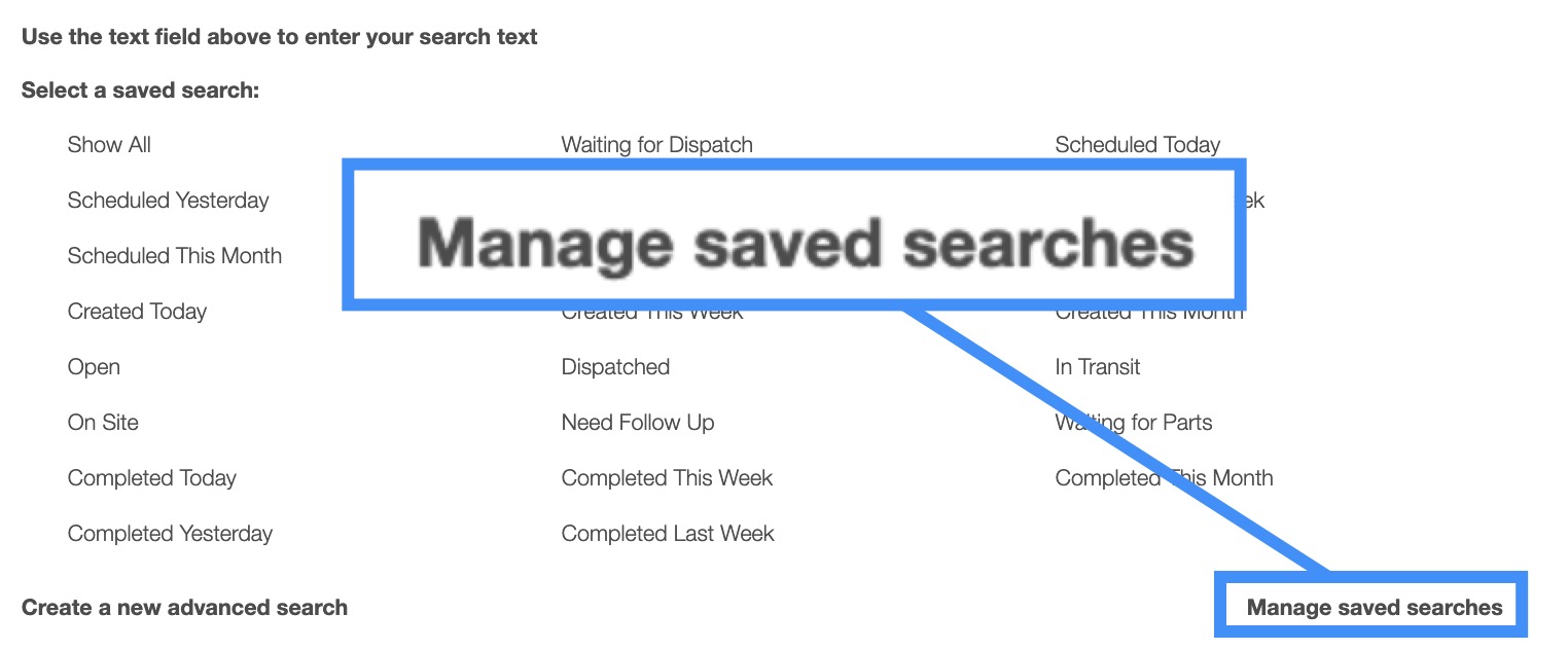 Saved searches are a powerful search tool where the search-criteria has been saved for future use; to access the saved searches drop-down, click in the search bar. The default saved search for Work Orders is the "Show All" search.