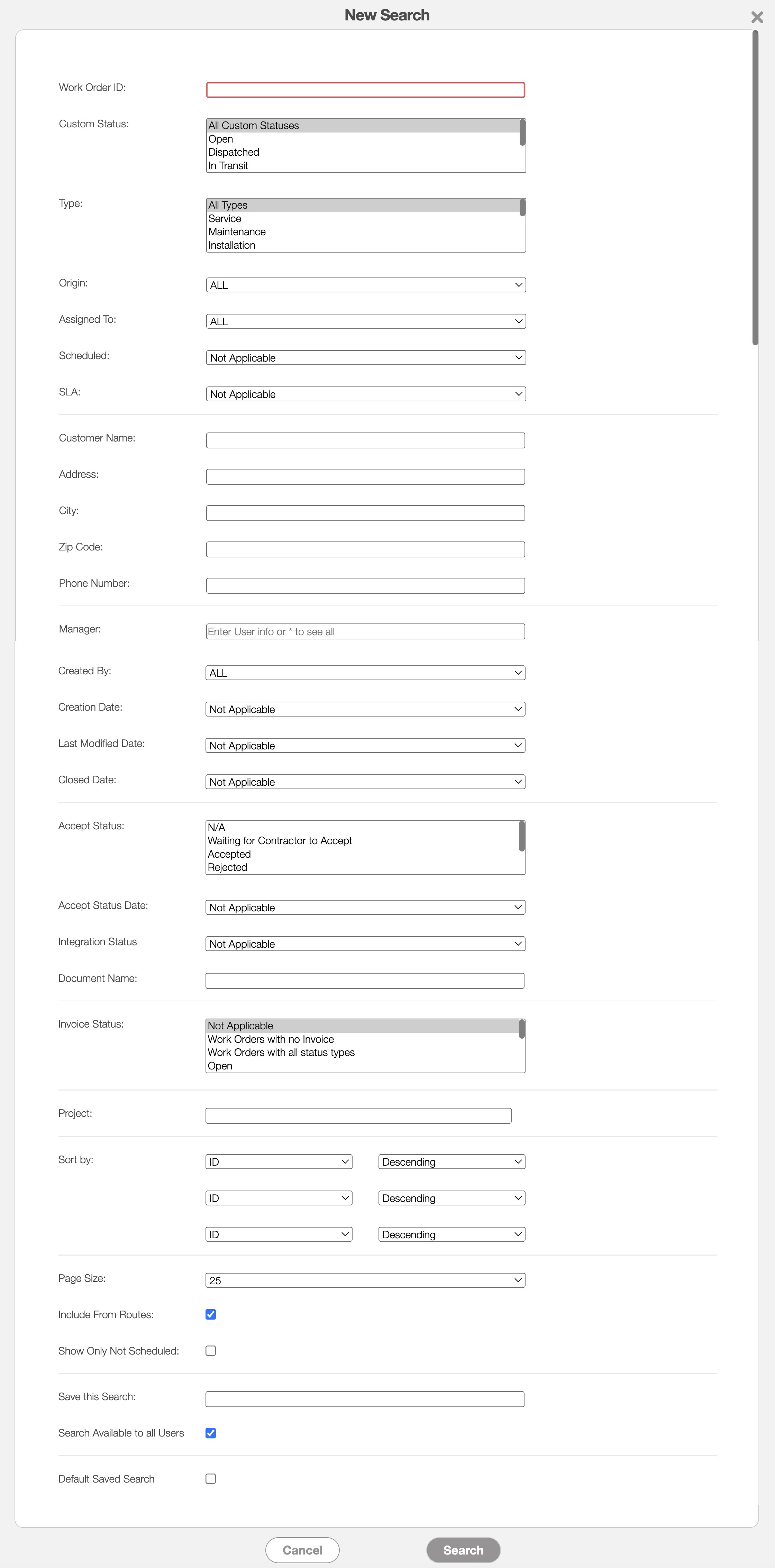 | "Sort By" | Sorts your search in ascending or descending order by: Priority, ID, Customer, Status, Created Date, Assigned To, Confirmation Status, Assigned Date, Custom Status, Work Order Type, Closed Date, SLA, Work Order Route, and Route Order. |