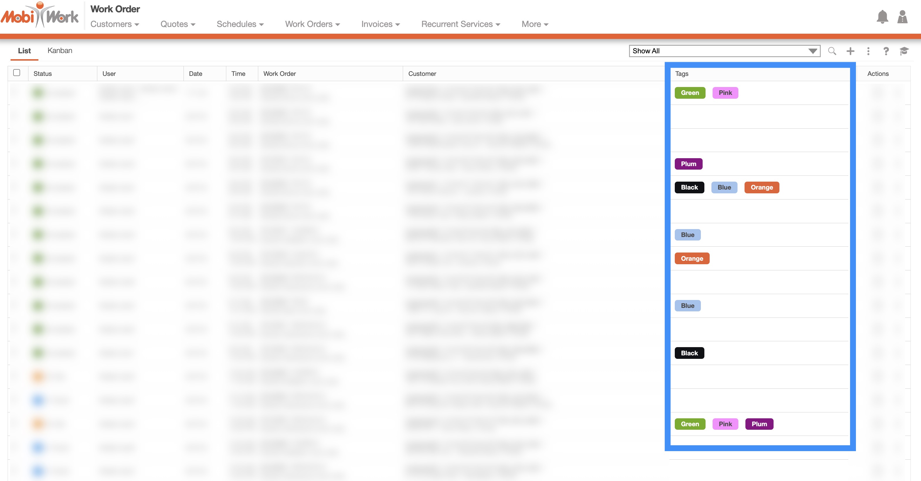 After adding tags to your Work Order settings page, a new column header will appear in your "List" tab. When you tag a work order, you will immediately see its associated tags in a convenient, at-a-glance display within the "List" tab: