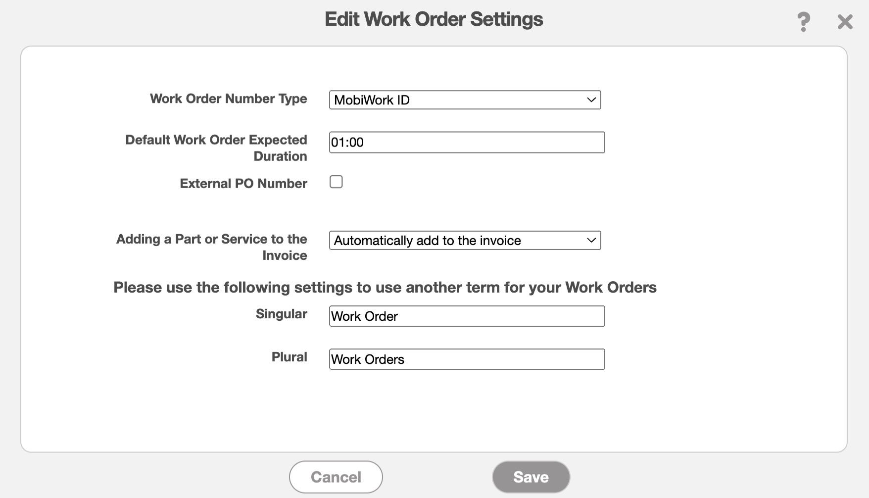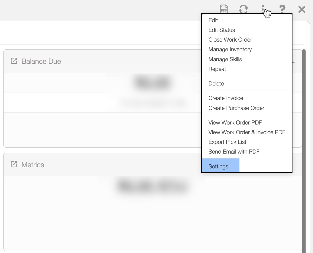 Once you select the Pencil icon, the Edit Work Order Settings pop-up window will appear: