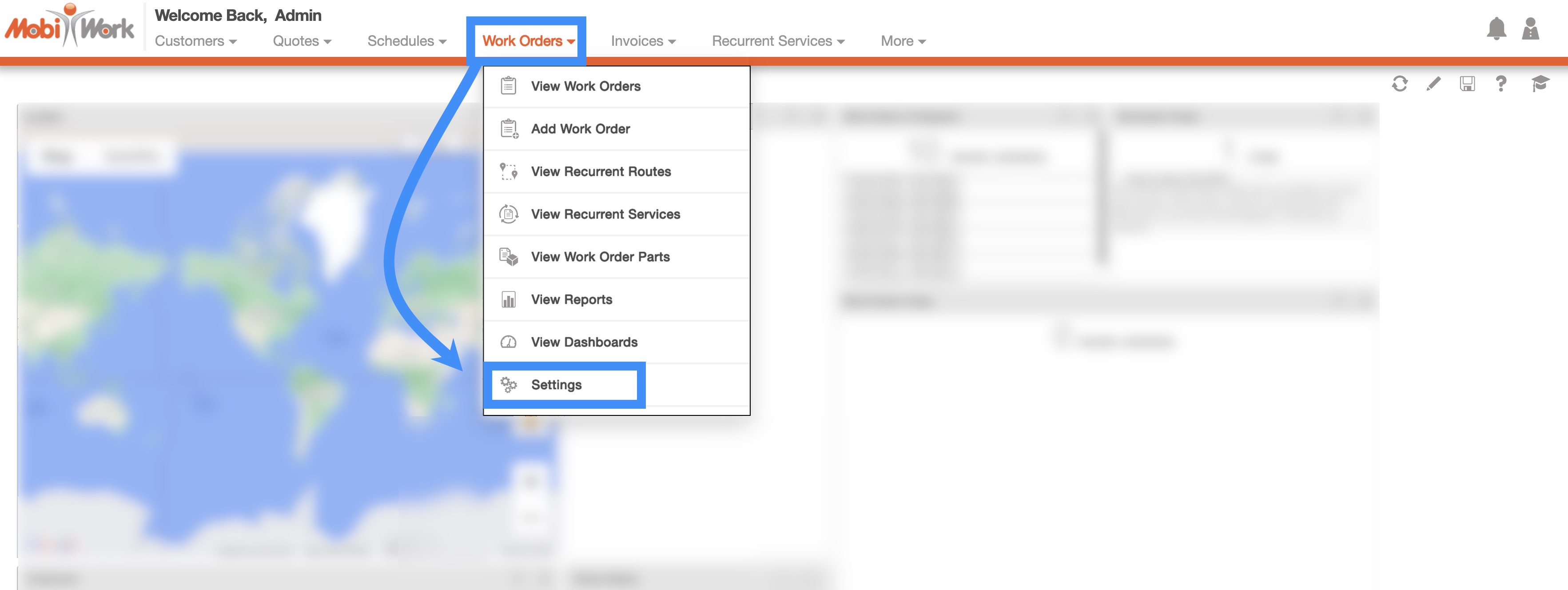 You can directly access the Settings page, by hovering over the Work Orders feature from your MobiWork menu, and clicking on the "Settings" option:
